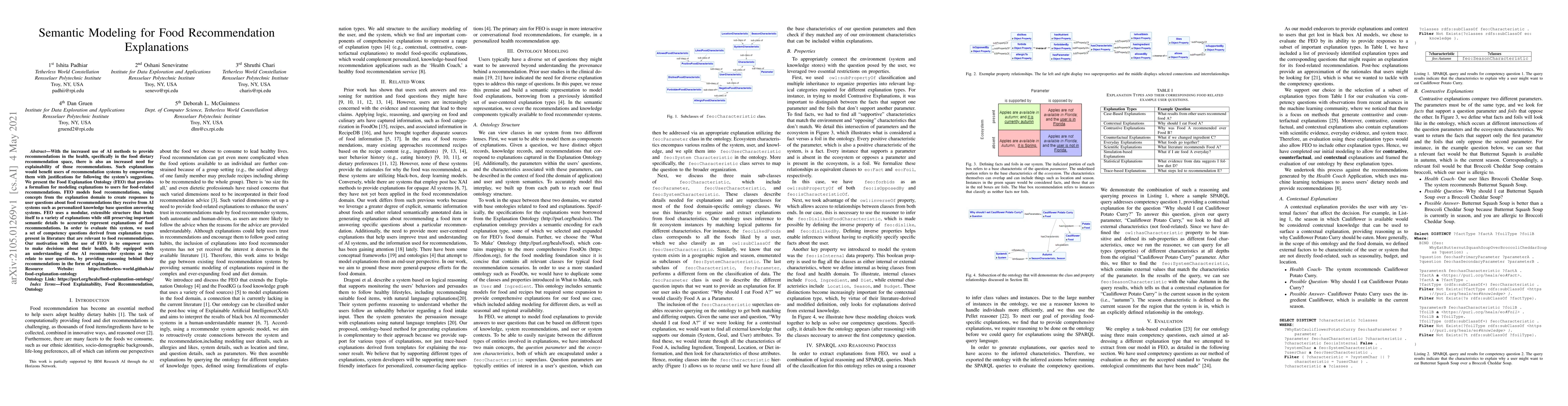 With the increased use of AI methods to provide recommendations in the health, specifically in the food dietary recommendation space, there is also an increased need for explainability of those recommendations. Such explanations would benefit users of recommendation systems by empowering them with justifications for following the system's suggestions. We present the Food Explanation Ontology (FEO) that provides a formalism for modeling explanations to users for food-related recommendations. FEO models food recommendations, using concepts from the explanation domain to create responses to user questions about food recommendations they receive from AI systems such as personalized knowledge base question answering systems. FEO uses a modular, extensible structure that lends itself to a variety of explanations while still preserving important semantic details to accurately represent explanations of food recommendations. In order to evaluate this system, we used a set of competency questions derived from explanation types present in literature that are relevant to food recommendations. Our motivation with the use of FEO is to empower users to make decisions about their health, fully equipped with an understanding of the AI recommender systems as they relate to user questions, by providing reasoning behind their recommendations in the form of explanations.