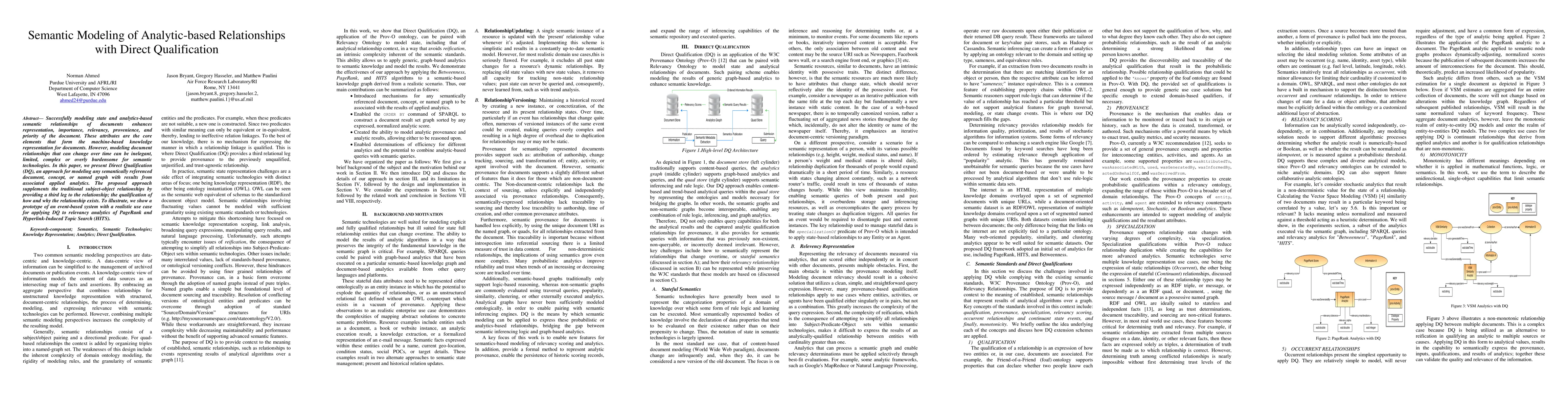 Successfully modeling state and analytics-based semantic relationships of documents enhances representation, importance, relevancy, provenience, and priority of the document. These attributes are the core elements that form the machine-based knowledge representation for documents. However, modeling document relationships that can change over time can be inelegant, limited, complex or overly burdensome for semantic technologies. In this paper, we present Direct Qualification (DQ), an approach for modeling any semantically referenced document, concept, or named graph with results from associated applied analytics. The proposed approach supplements the traditional subject-object relationships by providing a third leg to the relationship; the qualification of how and why the relationship exists. To illustrate, we show a prototype of an event-based system with a realistic use case for applying DQ to relevancy analytics of PageRank and Hyperlink-Induced Topic Search (HITS).