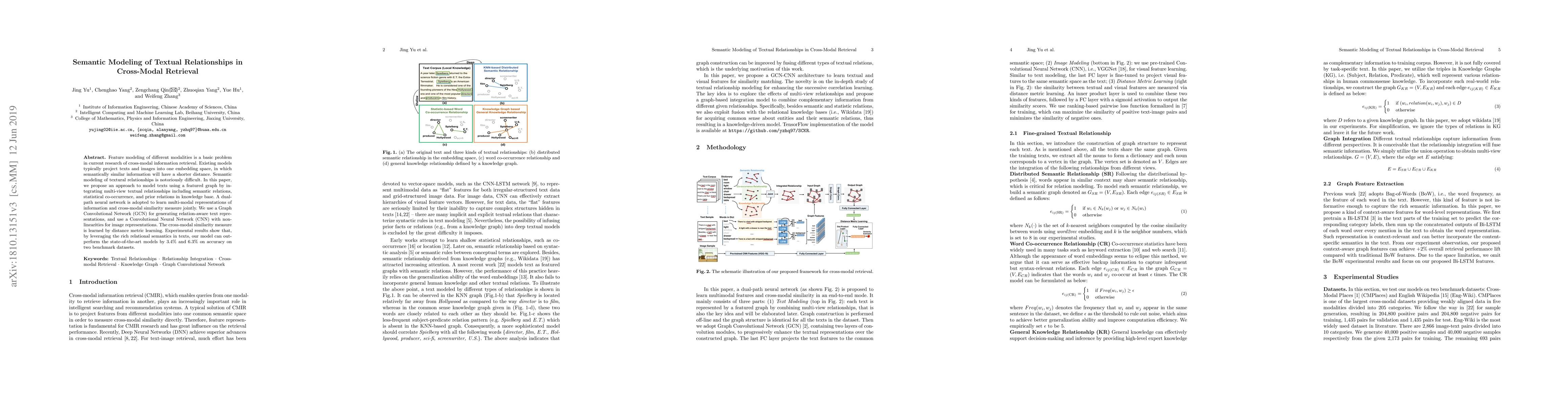 Feature modeling of different modalities is a basic problem in current research of cross-modal information retrieval. Existing models typically project texts and images into one embedding space, in which semantically similar information will have a shorter distance. Semantic modeling of textural relationships is notoriously difficult. In this paper, we propose an approach to model texts using a featured graph by integrating multi-view textual relationships including semantic relations, statistical co-occurrence, and prior relations in the knowledge base. A dual-path neural network is adopted to learn multi-modal representations of information and cross-modal similarity measure jointly. We use a Graph Convolutional Network (GCN) for generating relation-aware text representations, and use a Convolutional Neural Network (CNN) with non-linearities for image representations. The cross-modal similarity measure is learned by distance metric learning. Experimental results show that, by leveraging the rich relational semantics in texts, our model can outperform the state-of-the-art models by 3.4% and 6.3% on accuracy on two benchmark datasets.