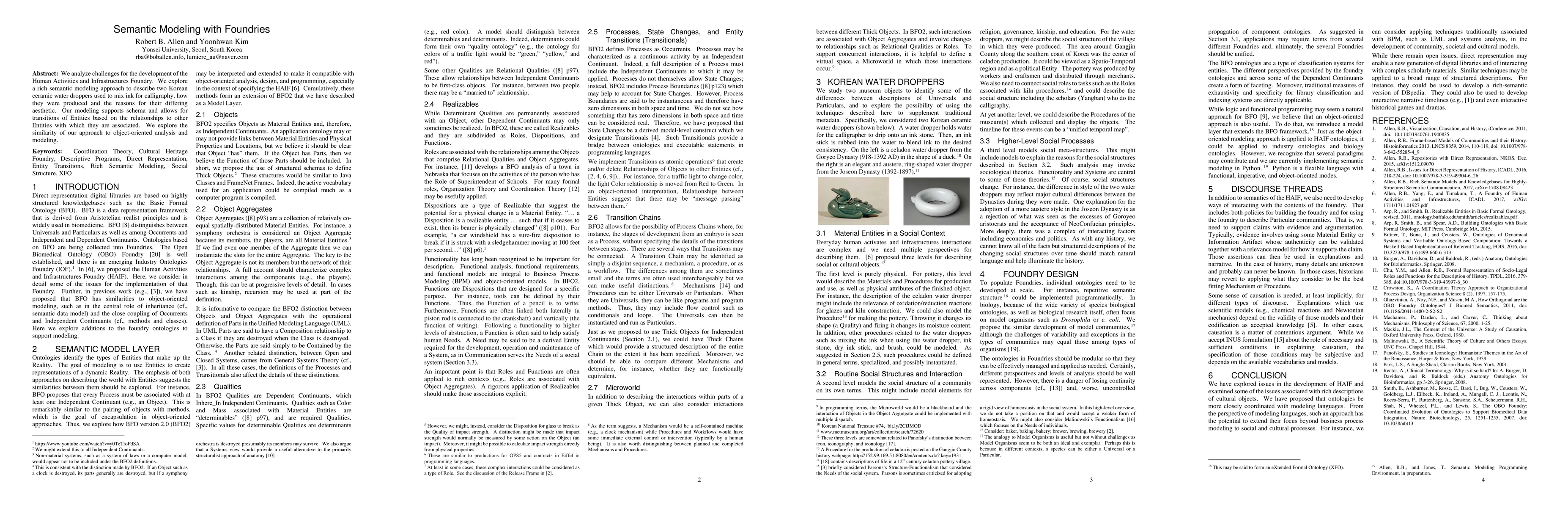 We analyze challenges for the development of the Human Activities and Infrastructures Foundry. We explore a rich semantic modeling approach to describe two Korean ceramic water droppers used to mix ink for calligraphy, how they were produced and the reasons for their differing aesthetic. Our modeling supports schema and allows for transitions of Entities based on the relationships to other Entities with which they are associated. We explore the similarity of our approach to object-oriented analysis and modeling.