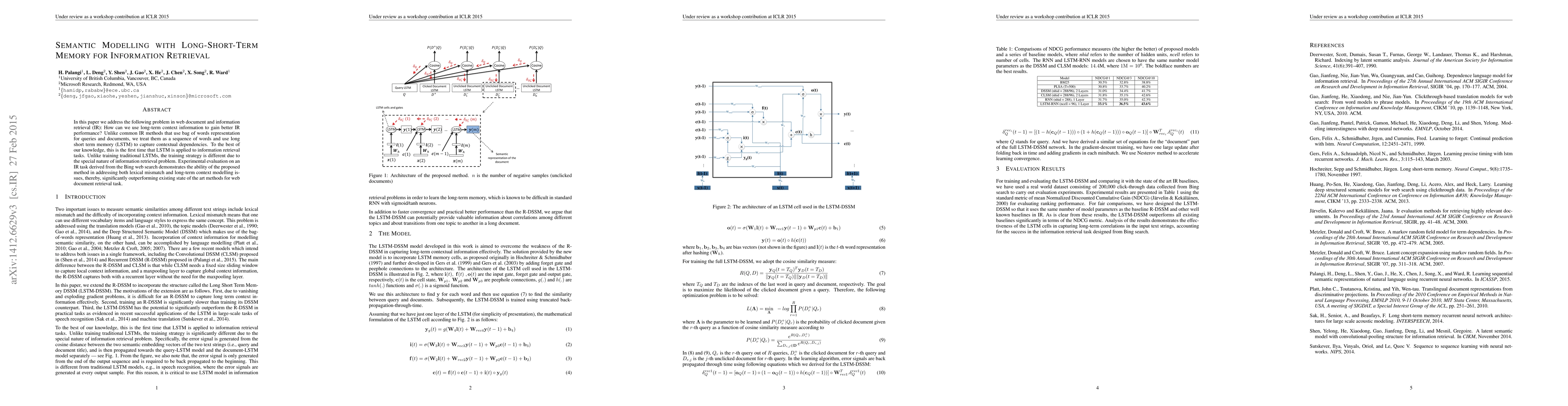 In this paper we address the following problem in web document and information retrieval (IR): How can we use long-term context information to gain better IR performance? Unlike common IR methods that use bag of words representation for queries and documents, we treat them as a sequence of words and use long short term memory (LSTM) to capture contextual dependencies. To the best of our knowledge, this is the first time that LSTM is applied to information retrieval tasks. Unlike training traditional LSTMs, the training strategy is different due to the special nature of information retrieval problem. Experimental evaluation on an IR task derived from the Bing web search demonstrates the ability of the proposed method in addressing both lexical mismatch and long-term context modelling issues, thereby, significantly outperforming existing state of the art methods for web document retrieval task.