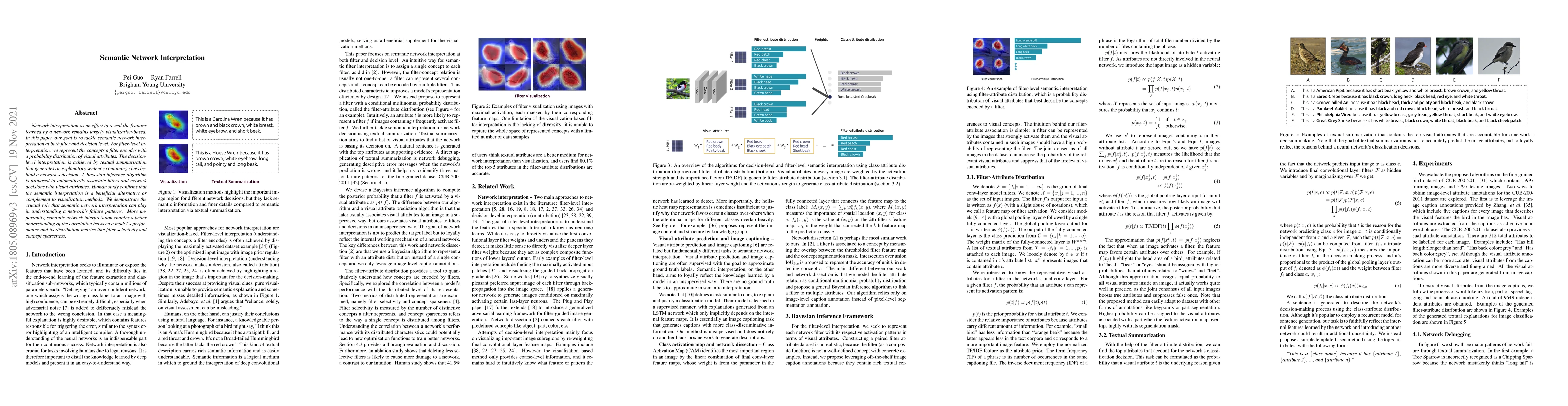 Network interpretation as an effort to reveal the features learned by a network remains largely visualization-based. In this paper, our goal is to tackle semantic network interpretation at both filter and decision level. For filter-level interpretation, we represent the concepts a filter encodes with a probability distribution of visual attributes. The decision-level interpretation is achieved by textual summarization that generates an explanatory sentence containing clues behind a network's decision. A Bayesian inference algorithm is proposed to automatically associate filters and network decisions with visual attributes. Human study confirms that the semantic interpretation is a beneficial alternative or complement to visualization methods. We demonstrate the crucial role that semantic network interpretation can play in understanding a network's failure patterns. More importantly, semantic network interpretation enables a better understanding of the correlation between a model's performance and its distribution metrics like filter selectivity and concept sparseness.