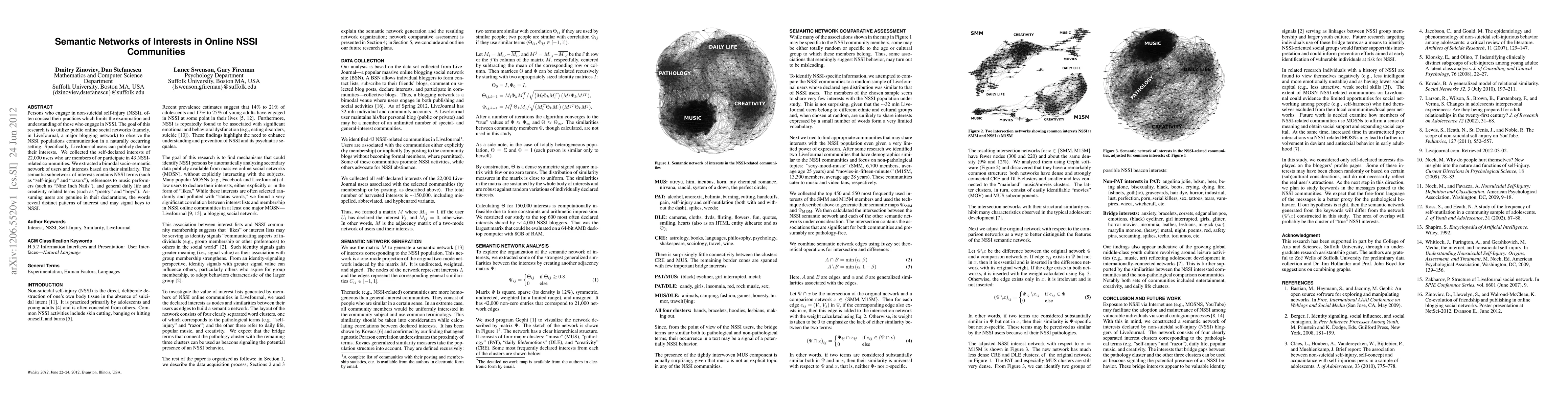Researchers analyzed public online communities of individuals with non-suicidal self-injury to identify patterns in their interests, revealing distinct groups including NSSI terms and creative pursuits. The study aims to better understand NSSI behaviors by leveraging naturally occurring data from social networks.
