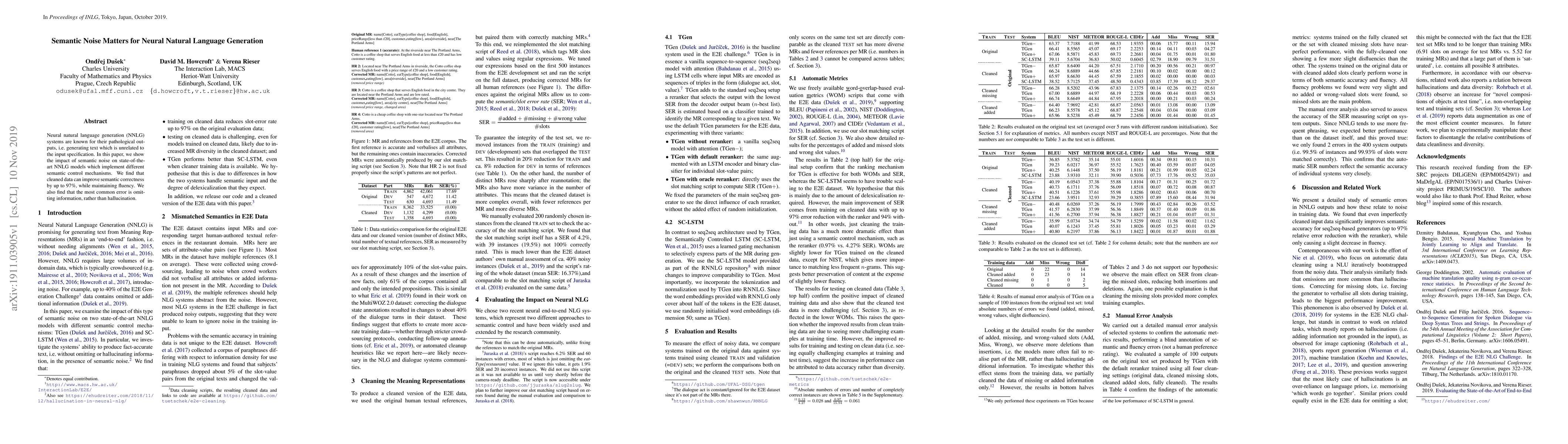 This paper investigates the effect of semantic noise on neural natural language generation (NNLG) models, demonstrating that cleaned data can enhance semantic correctness by up to 97% while preserving fluency, with the most frequent error being information omission rather than fabrication.