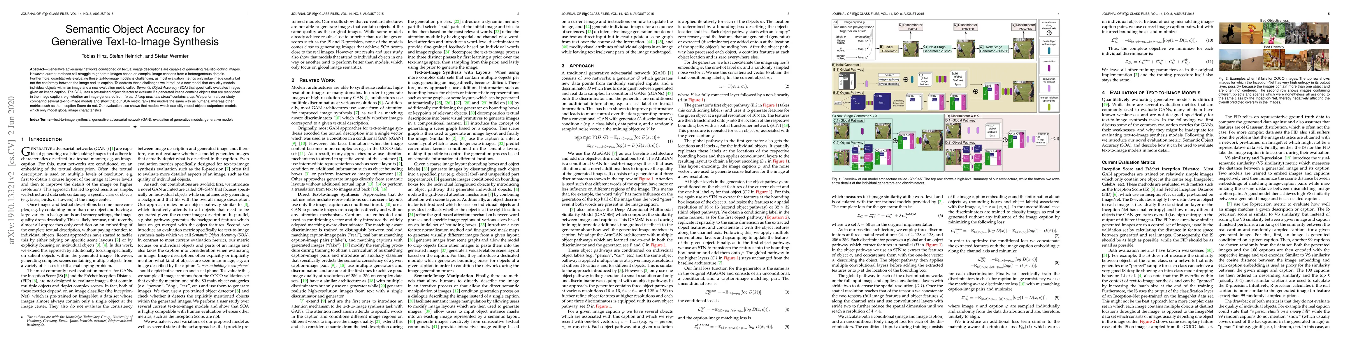 Generative adversarial networks conditioned on textual image descriptions are capable of generating realistic-looking images. However, current methods still struggle to generate images based on complex image captions from a heterogeneous domain. Furthermore, quantitatively evaluating these text-to-image models is challenging, as most evaluation metrics only judge image quality but not the conformity between the image and its caption. To address these challenges we introduce a new model that explicitly models individual objects within an image and a new evaluation metric called Semantic Object Accuracy (SOA) that specifically evaluates images given an image caption. The SOA uses a pre-trained object detector to evaluate if a generated image contains objects that are mentioned in the image caption, e.g. whether an image generated from "a car driving down the street" contains a car. We perform a user study comparing several text-to-image models and show that our SOA metric ranks the models the same way as humans, whereas other metrics such as the Inception Score do not. Our evaluation also shows that models which explicitly model objects outperform models which only model global image characteristics.