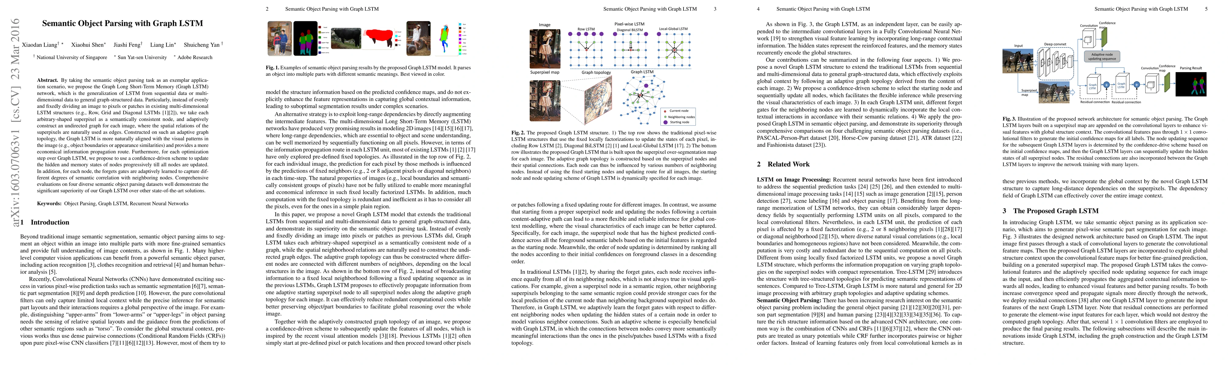 The paper proposes a Graph Long Short-Term Memory (Graph LSTM) network for semantic object parsing, generalizing LSTM for graph-structured data by representing images as adaptive graphs of superpixels. The Graph LSTM provides a more efficient information propagation route and demonstrates superior performance over other methods on four datasets.