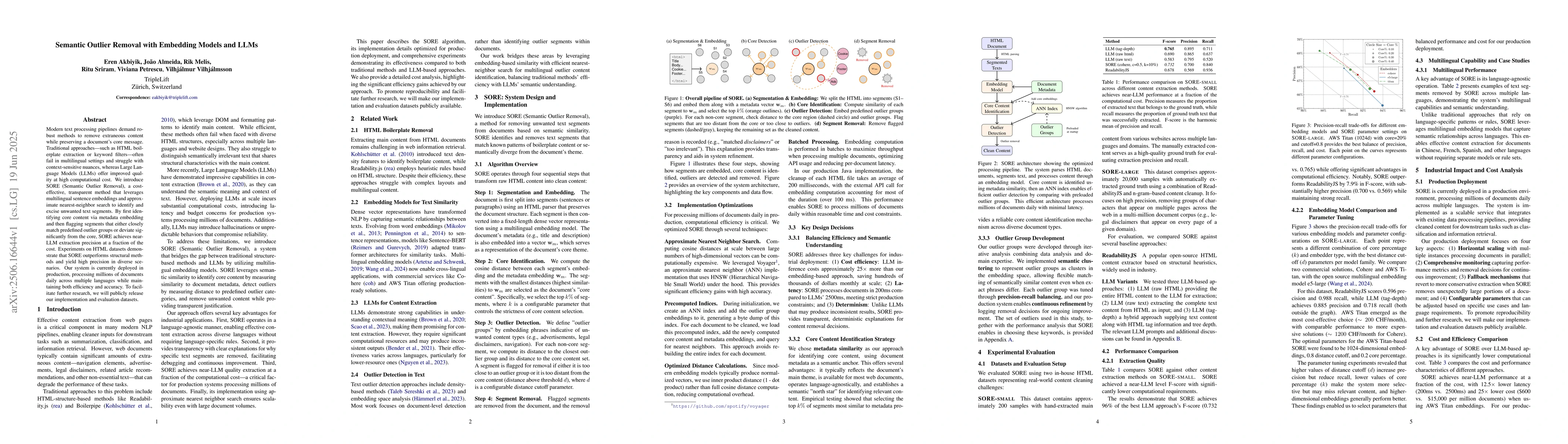 Modern text processing pipelines demand robust methods to remove extraneous content while preserving a document's core message. Traditional approaches such as HTML boilerplate extraction or keyword filters often fail in multilingual settings and struggle with context-sensitive nuances, whereas Large Language Models (LLMs) offer improved quality at high computational cost. We introduce SORE (Semantic Outlier Removal), a cost-effective, transparent method that leverages multilingual sentence embeddings and approximate nearest-neighbor search to identify and excise unwanted text segments. By first identifying core content via metadata embedding and then flagging segments that either closely match predefined outlier groups or deviate significantly from the core, SORE achieves near-LLM extraction precision at a fraction of the cost. Experiments on HTML datasets demonstrate that SORE outperforms structural methods and yield high precision in diverse scenarios. Our system is currently deployed in production, processing millions of documents daily across multiple languages while maintaining both efficiency and accuracy. To facilitate reproducibility and further research, we release our implementation and evaluation datasets.
