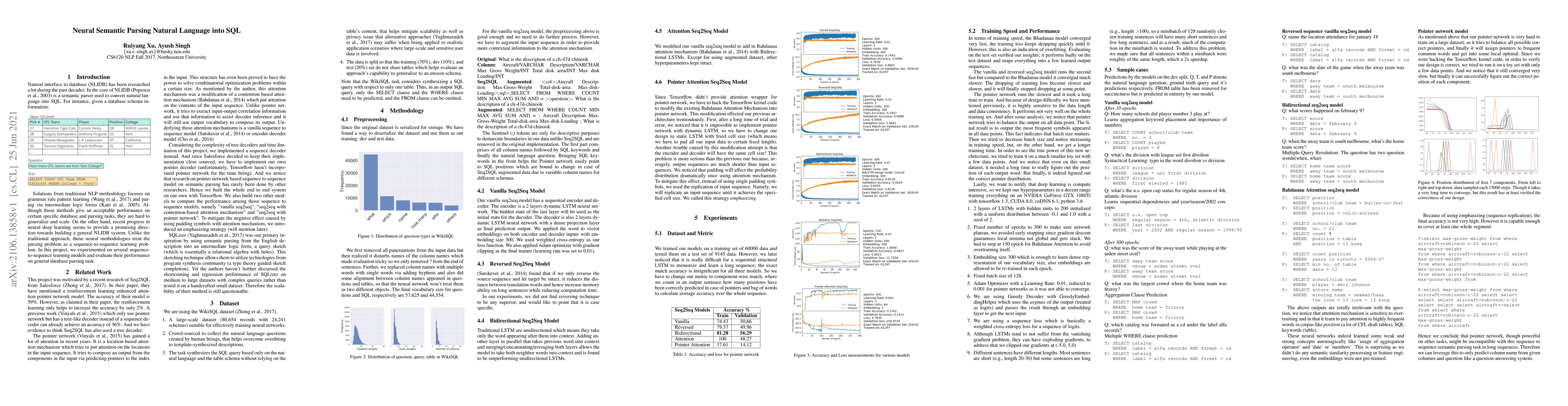 Natural interface to database (NLIDB) has been researched a lot during the past decades. In the core of NLIDB, is a semantic parser used to convert natural language into SQL. Solutions from traditional NLP methodology focuses on grammar rule pattern learning and pairing via intermediate logic forms. Although those methods give an acceptable performance on certain specific database and parsing tasks, they are hard to generalize and scale. On the other hand, recent progress in neural deep learning seems to provide a promising direction towards building a general NLIDB system. Unlike the traditional approach, those neural methodologies treat the parsing problem as a sequence-to-sequence learning problem. In this paper, we experimented on several sequence-to-sequence learning models and evaluate their performance on general database parsing task.