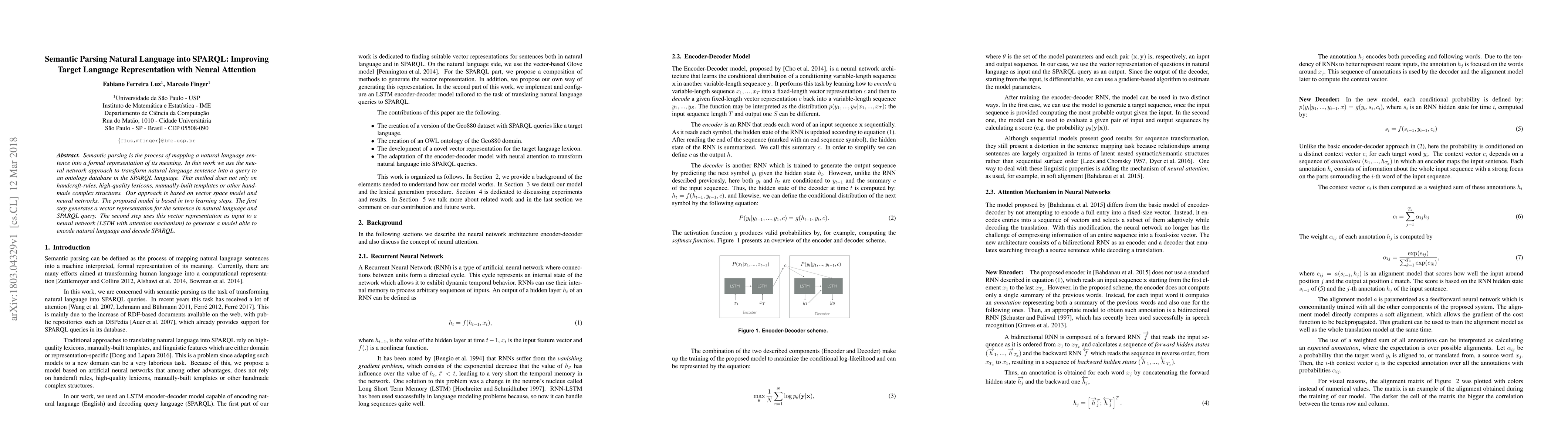 Title: Semantic Parsing Natural Language into SPARQL: Improving Target Language Representation with Neural Attention Summary: This paper proposes a neural network-based approach for semantic parsing that converts natural language sentences into SPARQL queries, using a vector space model and LSTM with attention mechanism to generate a representation without relying on handcrafted rules or lexicons.