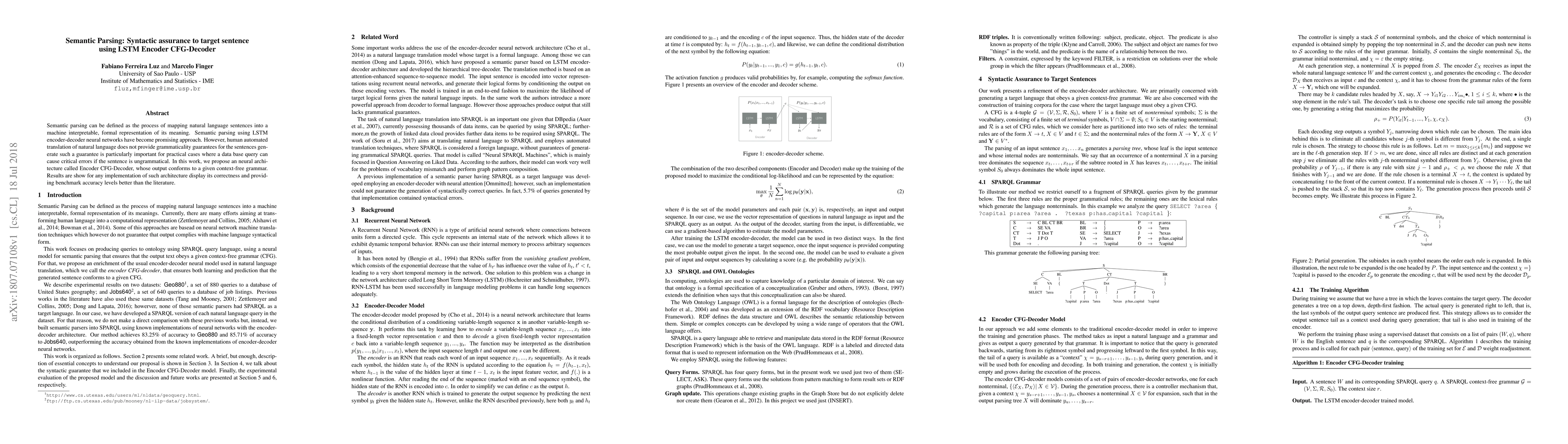 Title: Semantic Parsing: Syntactic assurance to target sentence using LSTM Encoder CFG-Decoder Summary: This research proposes a neural architecture called Encoder CFG-Decoder for semantic parsing, ensuring grammaticality via a context-free grammar, achieving better benchmark accuracy and syntactic correctness than existing methods.