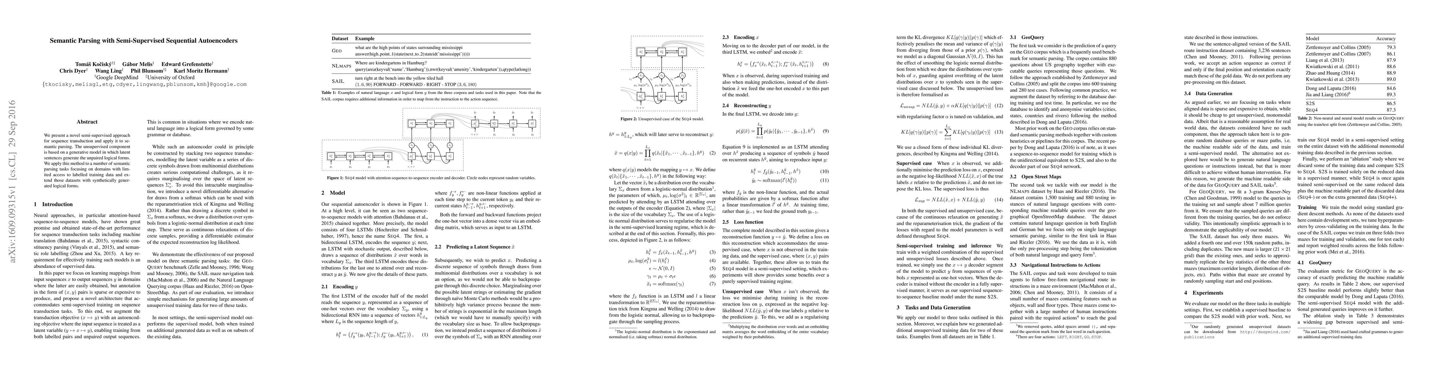 This paper introduces a semi-supervised approach for semantic parsing using sequential autoencoders, leveraging an unsupervised generative model to create synthetic logical forms, thereby addressing the challenge of limited labeled training data in certain domains. The method demonstrates effectiveness across various semantic parsing tasks.