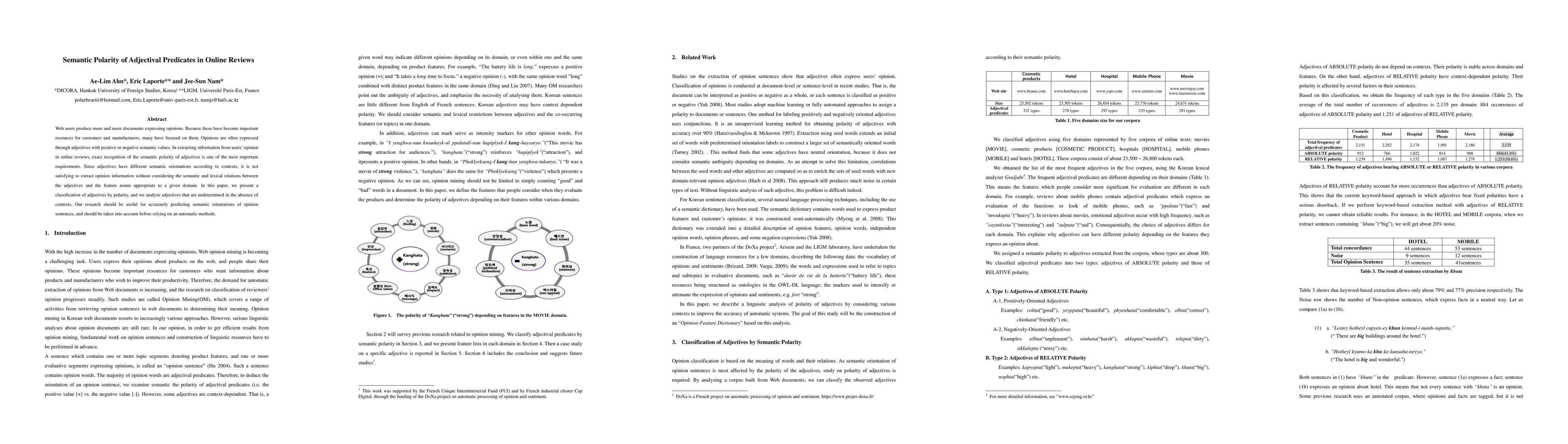 This paper classifies adjectives by polarity in online reviews to accurately predict semantic orientations, emphasizing the importance of context in determining the semantic orientation of adjectives and suggesting this approach enhances the reliability of automatic opinion extraction methods.