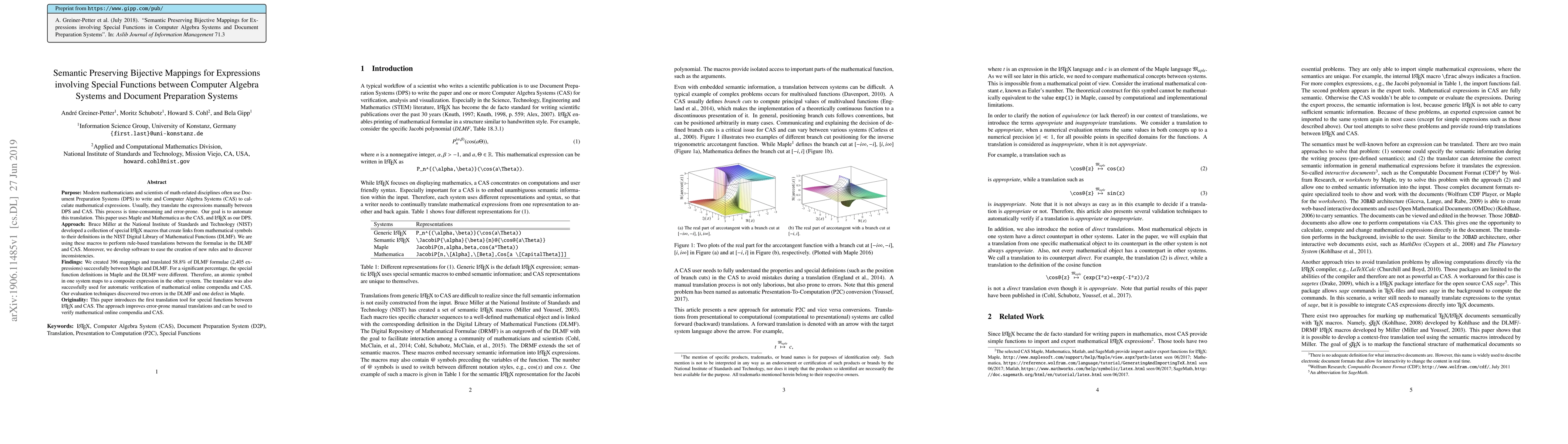 This paper develops a translation tool to automate the conversion of mathematical expressions between Document Preparation Systems (LaTeX) and Computer Algebra Systems (Maple and Mathematica), focusing on special functions. The tool successfully translated 58.8% of expressions and identified inconsistencies, demonstrating its potential to reduce manual errors and verify mathematical compendia.