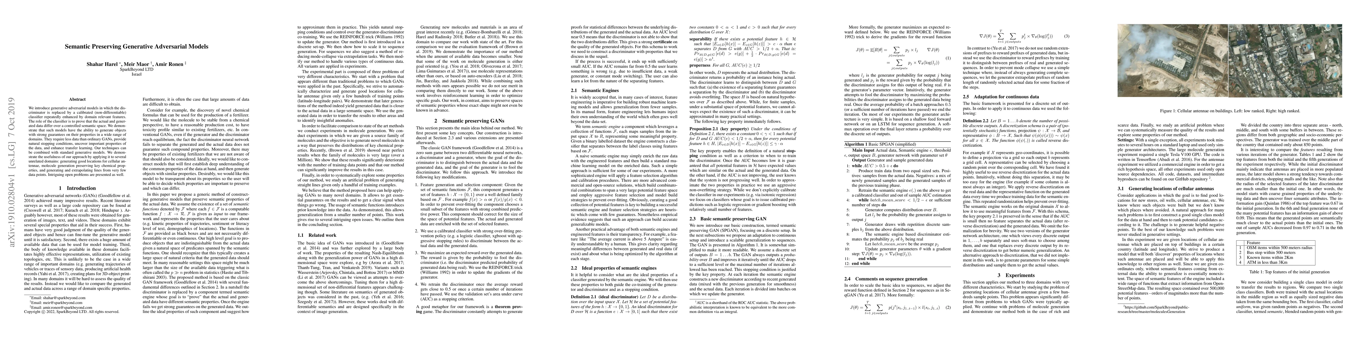 The paper introduces Semantic Preserving Generative Adversarial Models (SPGANs) that replace the traditional GAN discriminator with a calibrated classifier, enhancing it iteratively with domain-relevant features. This approach ensures strong guarantees on generated objects' properties, requiring less data and providing natural stopping conditions.
