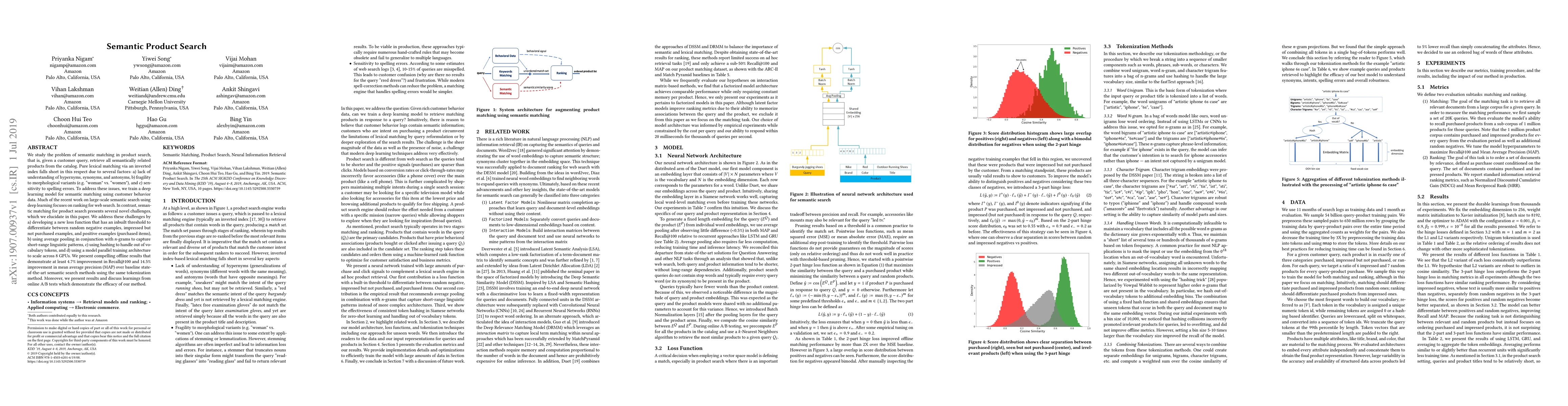 This paper tackles semantic matching in product search by developing a deep learning model that addresses issues like synonym understanding, morphological variations, and spelling errors. The authors introduce novel techniques such as a new loss function, n-grams with average pooling, hashing for out-of-vocabulary tokens, and model parallel training, achieving significant improvements in Recall@100 and mean average precision over baseline methods.