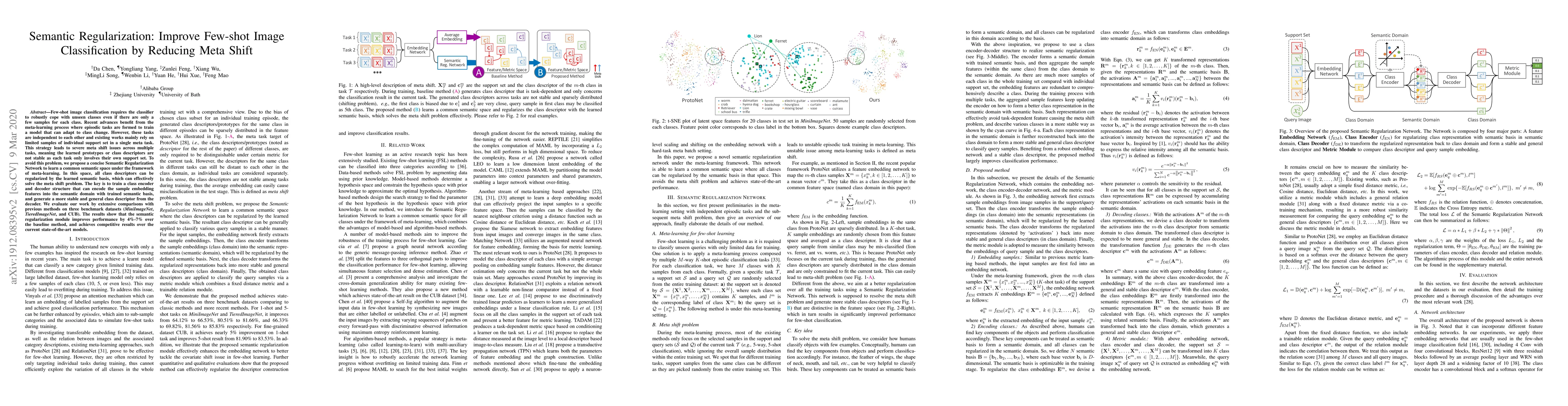 The paper proposes a Semantic Regularization Network to address meta shift issues in few-shot image classification by learning a common semantic space, which stabilizes class descriptors across tasks. The method employs a class encoder and decoder to generate more stable and general class descriptors, achieving a 4%-7% performance improvement over baseline methods on benchmark datasets.