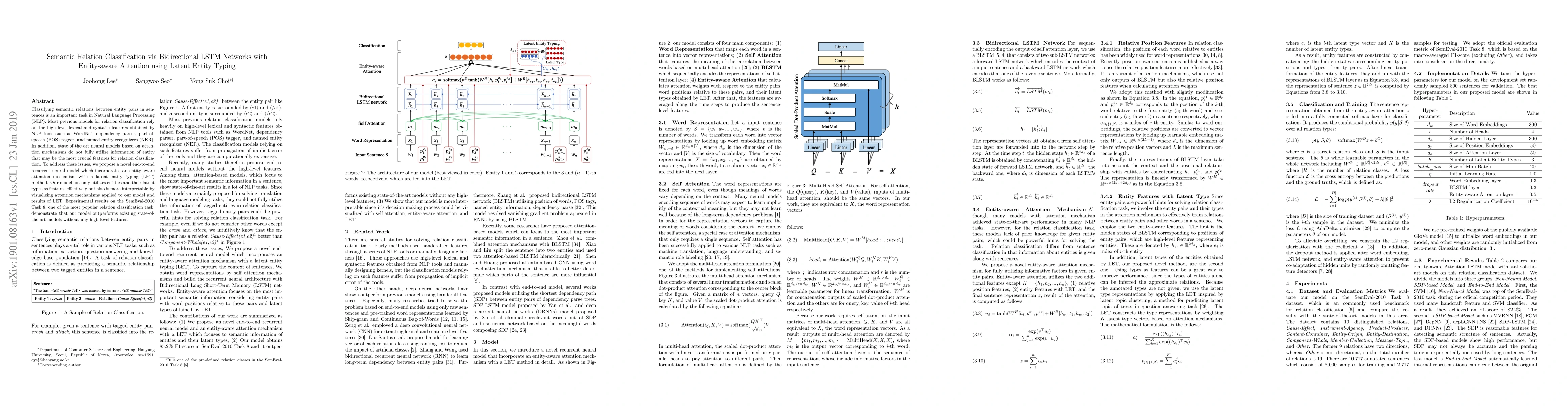 This paper proposes a novel bidirectional LSTM network with an entity-aware attention mechanism and latent entity typing to classify semantic relations between entity pairs. The model outperforms existing methods on the SemEval-2010 Task 8 without relying on high-level NLP features.