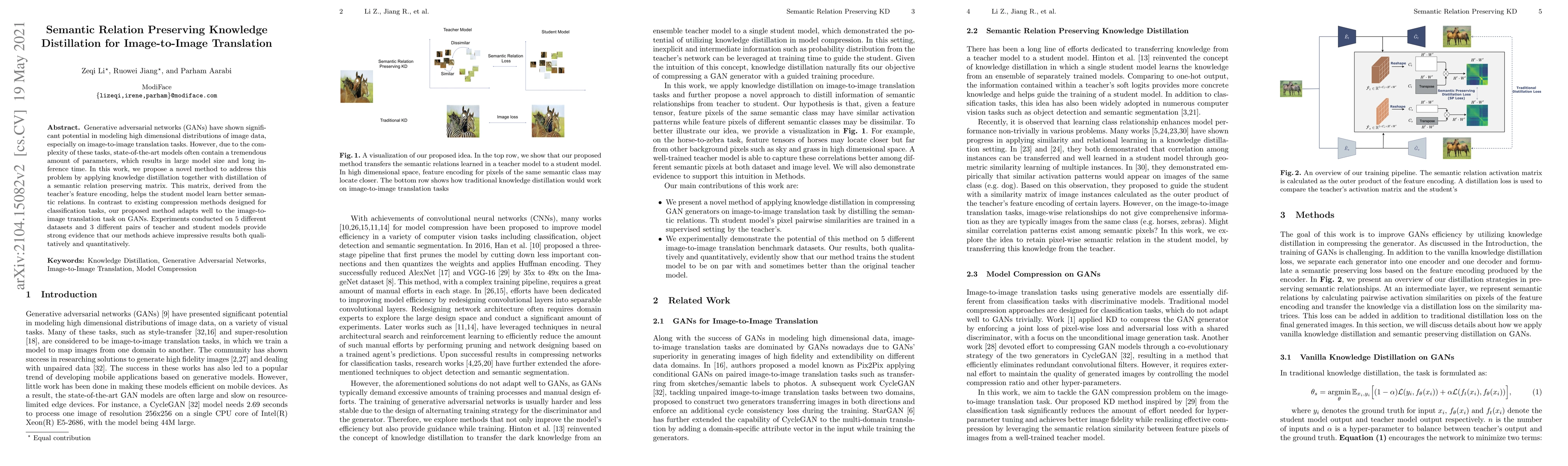 This paper proposes a novel knowledge distillation method for GANs that incorporates a semantic relation preserving matrix to improve image-to-image translation tasks. The method effectively compresses large models while maintaining high-quality translations, outperforming existing compression techniques.