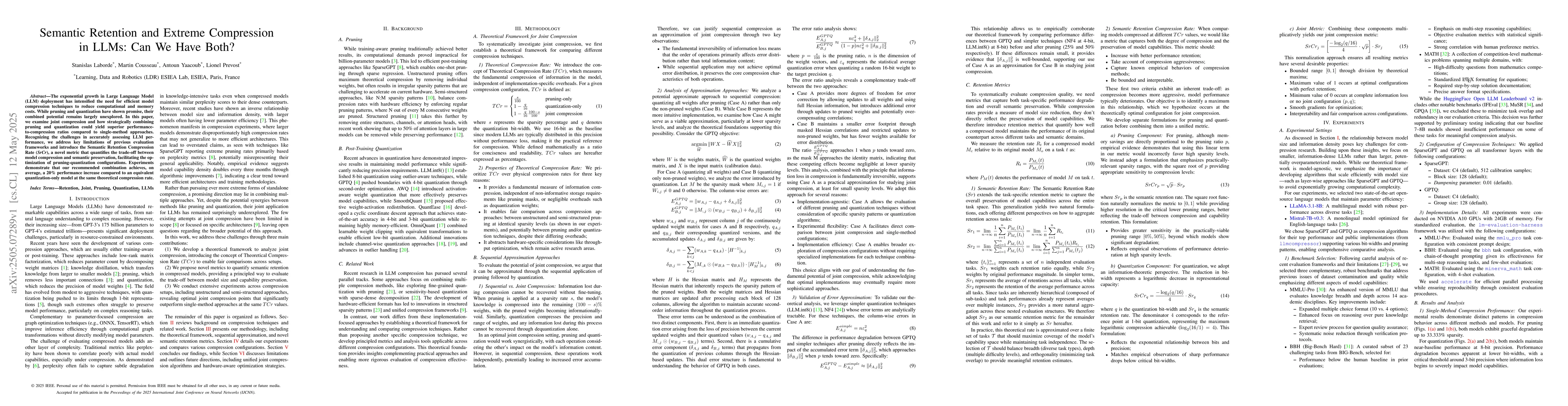 This work stands out by systematically examining the joint compression of LLMs via pruning and quantization, and by proposing a novel evaluation metric, SrCr, to measure the trade-off between compression and semantic preservation.