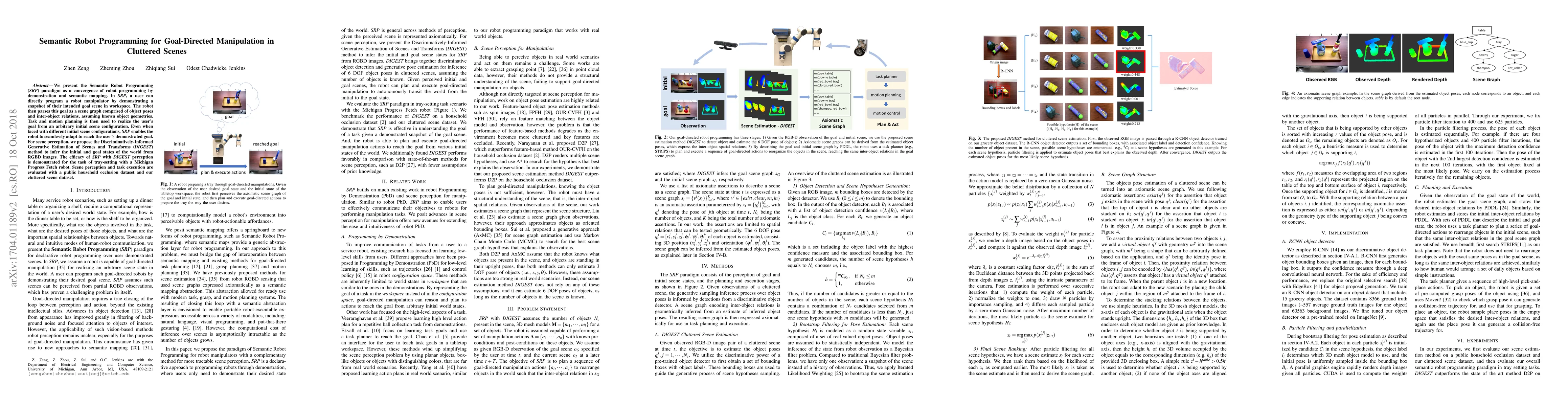 This paper introduces Semantic Robot Programming (SRP) to enable robots to achieve goal-directed manipulation in cluttered scenes by demonstrating desired goal states. The proposed Discriminatively-Informed Generative Estimation of Scenes and Transforms (DIGEST) method enhances scene perception, allowing robots to adapt to different initial configurations and successfully execute tasks like tray-setting.