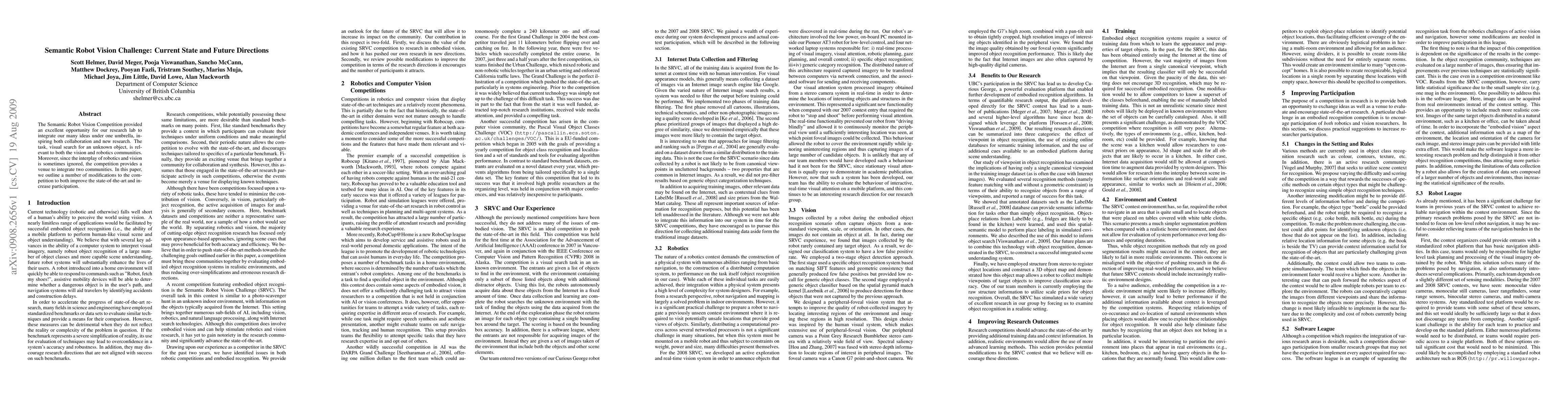 The Semantic Robot Vision Competition provided an excellent opportunity for our research lab to integrate our many ideas under one umbrella, inspiring both collaboration and new research. The task, visual search for an unknown object, is relevant to both the vision and robotics communities. Moreover, since the interplay of robotics and vision is sometimes ignored, the competition provides a venue to integrate two communities. In this paper, we outline a number of modifications to the competition to both improve the state-of-the-art and increase participation.