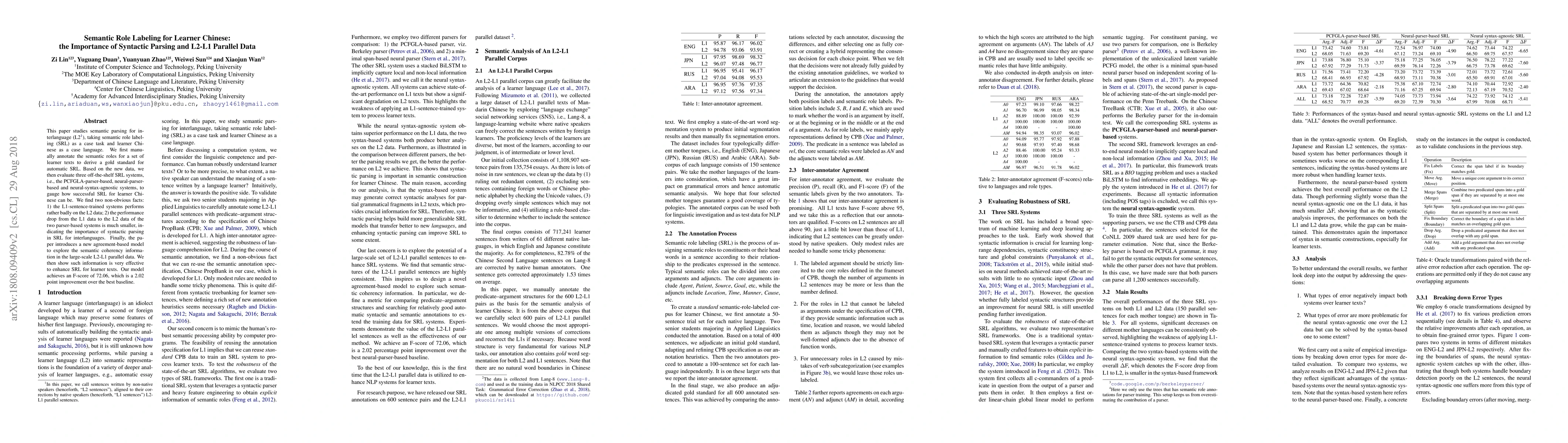This paper evaluates semantic role labeling (SRL) for learner Chinese using various SRL systems and finds that syntactic parsing is crucial. A new agreement-based model leveraging L2-L1 parallel data enhances SRL performance, achieving an F-score of 72.06, a notable improvement over existing baselines.