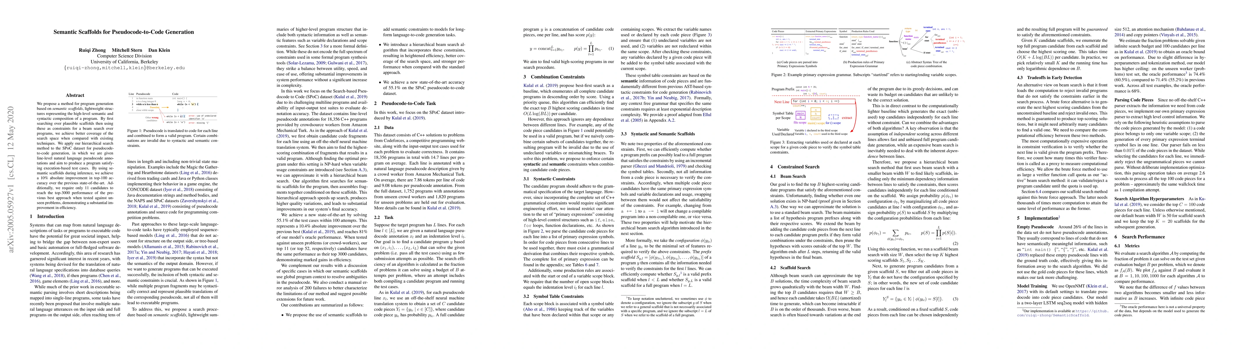 This paper introduces a method for pseudocode-to-code generation using semantic scaffolds, which are lightweight structures representing program semantics and syntax. The method improves search space coverage and efficiency, achieving a 10% absolute improvement in accuracy and requiring fewer candidates for top performance compared to prior techniques.