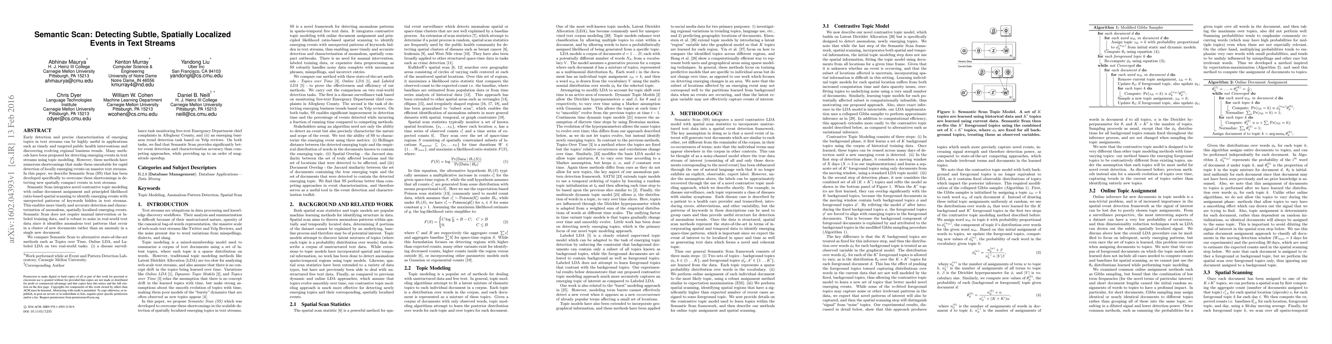 Semantic Scan is a novel method for detecting spatially localized emerging events in text streams, combining contrastive topic modeling and spatial scanning to identify anomalous patterns without manual intervention. It outperforms existing methods in accuracy and speed on tasks like disease surveillance and business trend detection.
