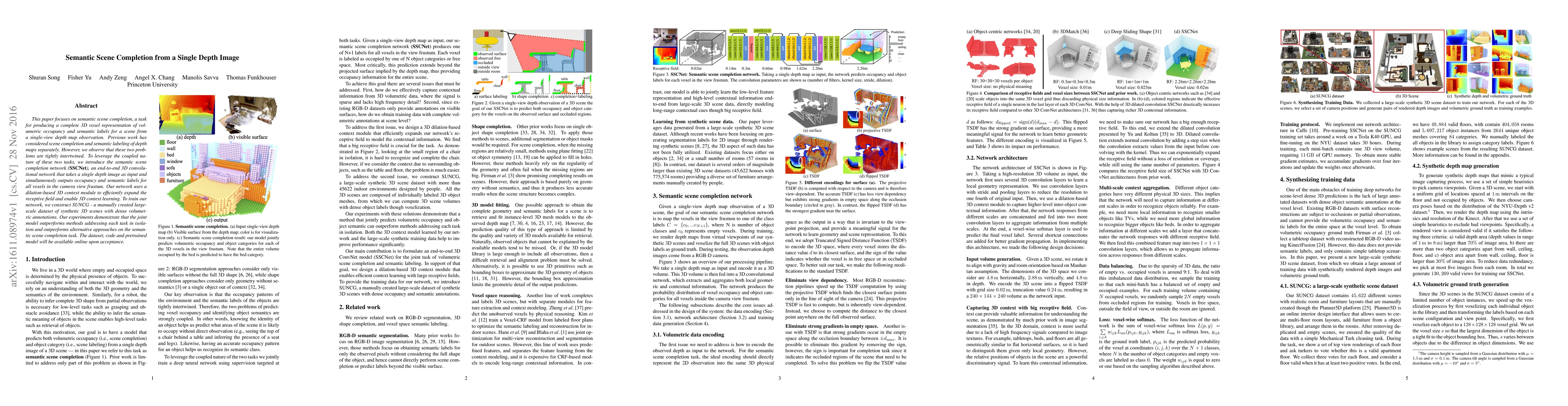 This paper presents SSCNet, an end-to-end 3D convolutional network for semantic scene completion from a single depth image, achieving simultaneous 3D occupancy and semantic labeling. The network uses a dilation-based 3D context module and is trained on the newly created SUNCG dataset, outperforming isolated scene completion and labeling methods.