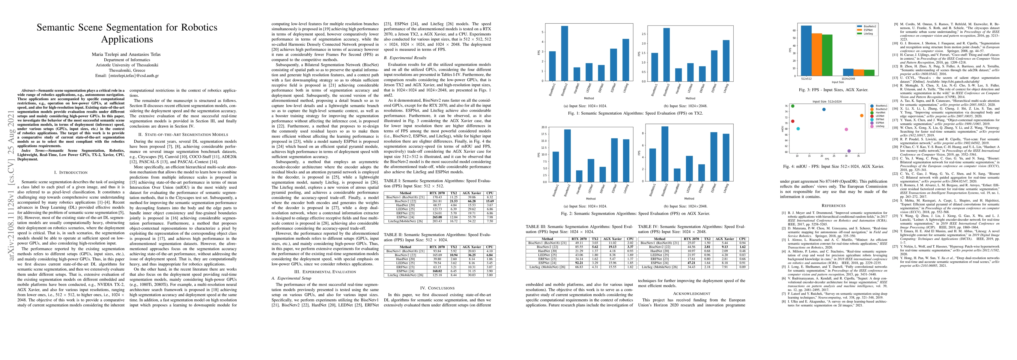 This paper investigates how well-known semantic scene segmentation models perform on low-power GPUs with high-resolution input for robotics applications, aiming to select the most suitable model.