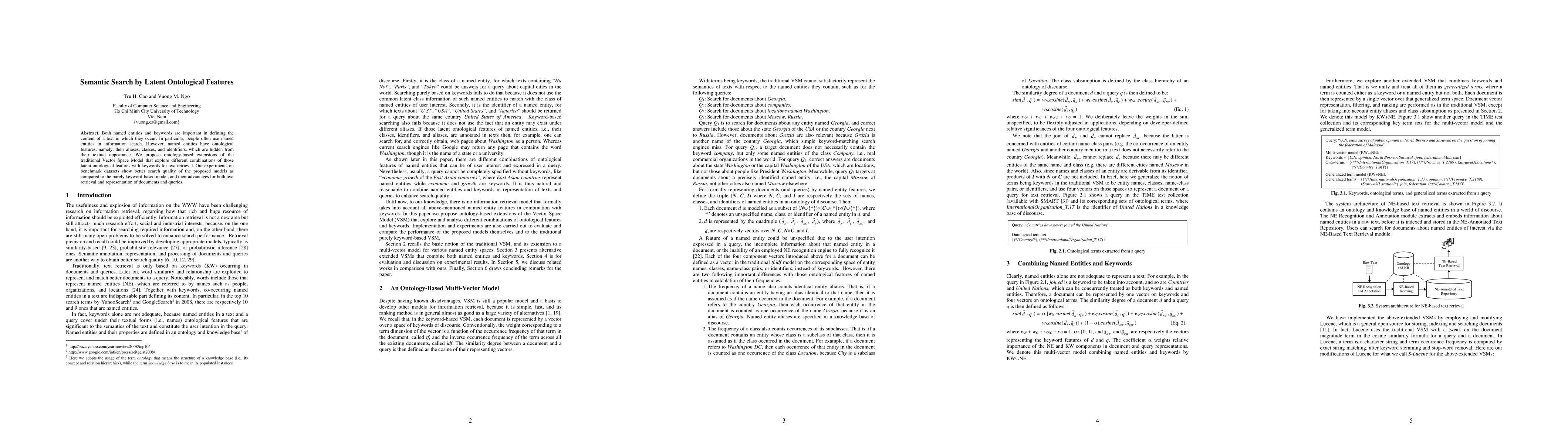 Both named entities and keywords are important in defining the content of a text in which they occur. In particular, people often use named entities in information search. However, named entities have ontological features, namely, their aliases, classes, and identifiers, which are hidden from their textual appearance. We propose ontology-based extensions of the traditional Vector Space Model that explore different combinations of those latent ontological features with keywords for text retrieval. Our experiments on benchmark datasets show better search quality of the proposed models as compared to the purely keyword-based model, and their advantages for both text retrieval and representation of documents and queries.