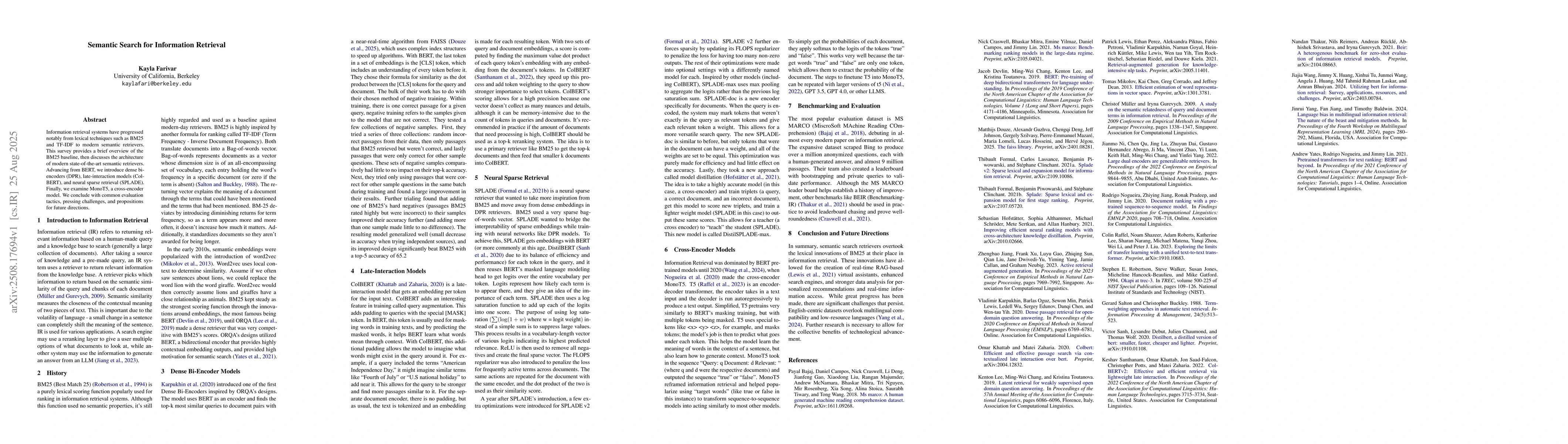 Information retrieval systems have progressed notably from lexical techniques such as BM25 and TF-IDF to modern semantic retrievers. This survey provides a brief overview of the BM25 baseline, then discusses the architecture of modern state-of-the-art semantic retrievers. Advancing from BERT, we introduce dense bi-encoders (DPR), late-interaction models (ColBERT), and neural sparse retrieval (SPLADE). Finally, we examine MonoT5, a cross-encoder model. We conclude with common evaluation tactics, pressing challenges, and propositions for future directions.