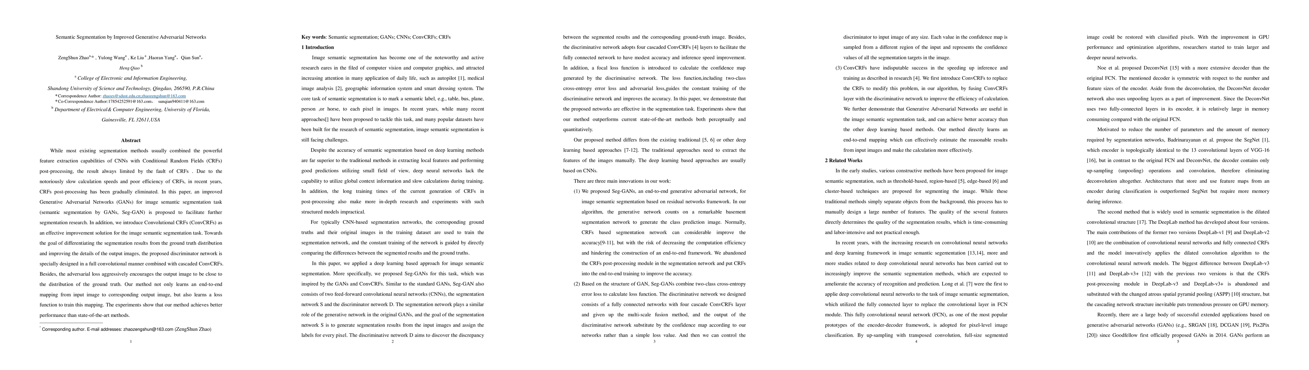 This paper proposes an improved Generative Adversarial Network (GAN) called Seg-GAN for semantic segmentation, integrating Convolutional CRFs (ConvCRFs) for enhanced detail and accuracy. The discriminator network, designed in a full convolutional manner, combined with cascaded ConvCRFs, improves segmentation results by learning an end-to-end mapping and loss function, outperforming existing state-of-the-art methods.