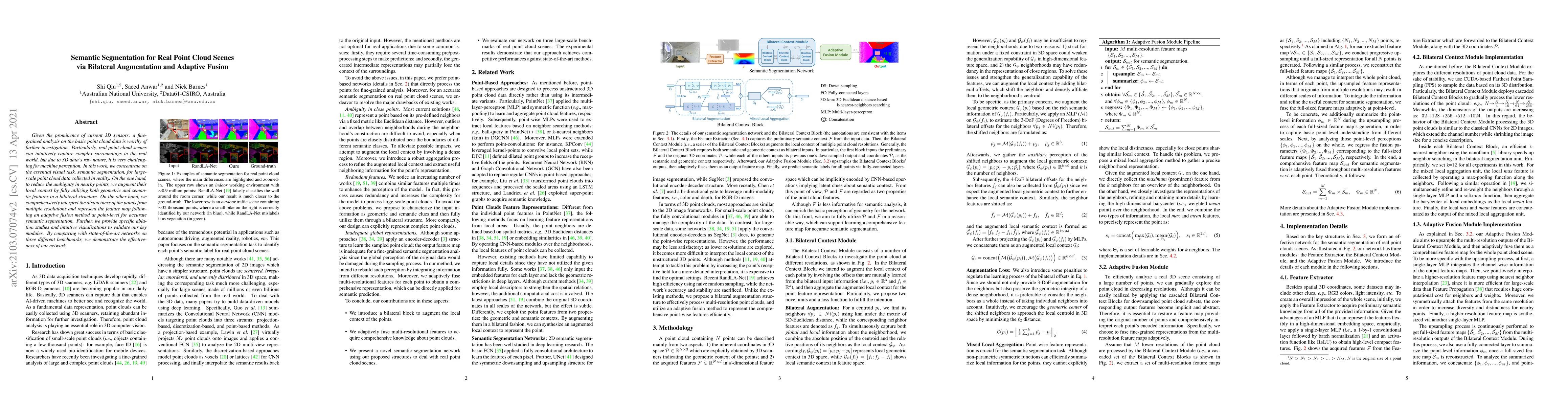Given the prominence of current 3D sensors, a fine-grained analysis on the basic point cloud data is worthy of further investigation. Particularly, real point cloud scenes can intuitively capture complex surroundings in the real world, but due to 3D data's raw nature, it is very challenging for machine perception. In this work, we concentrate on the essential visual task, semantic segmentation, for large-scale point cloud data collected in reality. On the one hand, to reduce the ambiguity in nearby points, we augment their local context by fully utilizing both geometric and semantic features in a bilateral structure. On the other hand, we comprehensively interpret the distinctness of the points from multiple resolutions and represent the feature map following an adaptive fusion method at point-level for accurate semantic segmentation. Further, we provide specific ablation studies and intuitive visualizations to validate our key modules. By comparing with state-of-the-art networks on three different benchmarks, we demonstrate the effectiveness of our network.