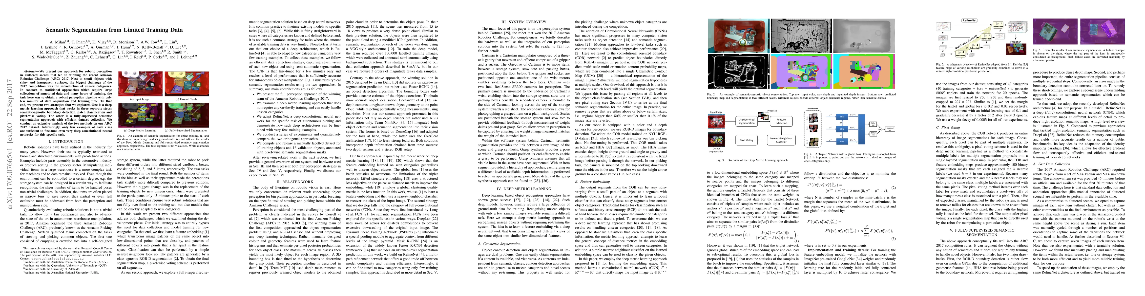 We present our approach for robotic perception in cluttered scenes that led to winning the recent Amazon Robotics Challenge (ARC) 2017. Next to small objects with shiny and transparent surfaces, the biggest challenge of the 2017 competition was the introduction of unseen categories. In contrast to traditional approaches which require large collections of annotated data and many hours of training, the task here was to obtain a robust perception pipeline with only few minutes of data acquisition and training time. To that end, we present two strategies that we explored. One is a deep metric learning approach that works in three separate steps: semantic-agnostic boundary detection, patch classification and pixel-wise voting. The other is a fully-supervised semantic segmentation approach with efficient dataset collection. We conduct an extensive analysis of the two methods on our ARC 2017 dataset. Interestingly, only few examples of each class are sufficient to fine-tune even very deep convolutional neural networks for this specific task.