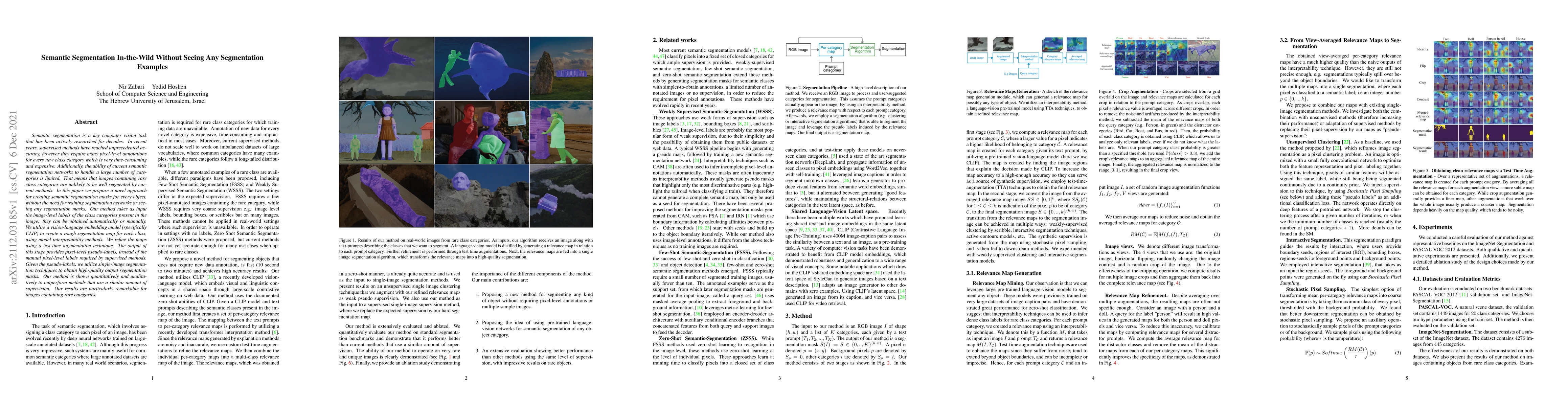 Semantic segmentation is a key computer vision task that has been actively researched for decades. In recent years, supervised methods have reached unprecedented accuracy, however they require many pixel-level annotations for every new class category which is very time-consuming and expensive. Additionally, the ability of current semantic segmentation networks to handle a large number of categories is limited. That means that images containing rare class categories are unlikely to be well segmented by current methods. In this paper we propose a novel approach for creating semantic segmentation masks for every object, without the need for training segmentation networks or seeing any segmentation masks. Our method takes as input the image-level labels of the class categories present in the image; they can be obtained automatically or manually. We utilize a vision-language embedding model (specifically CLIP) to create a rough segmentation map for each class, using model interpretability methods. We refine the maps using a test-time augmentation technique. The output of this stage provides pixel-level pseudo-labels, instead of the manual pixel-level labels required by supervised methods. Given the pseudo-labels, we utilize single-image segmentation techniques to obtain high-quality output segmentation masks. Our method is shown quantitatively and qualitatively to outperform methods that use a similar amount of supervision. Our results are particularly remarkable for images containing rare categories.