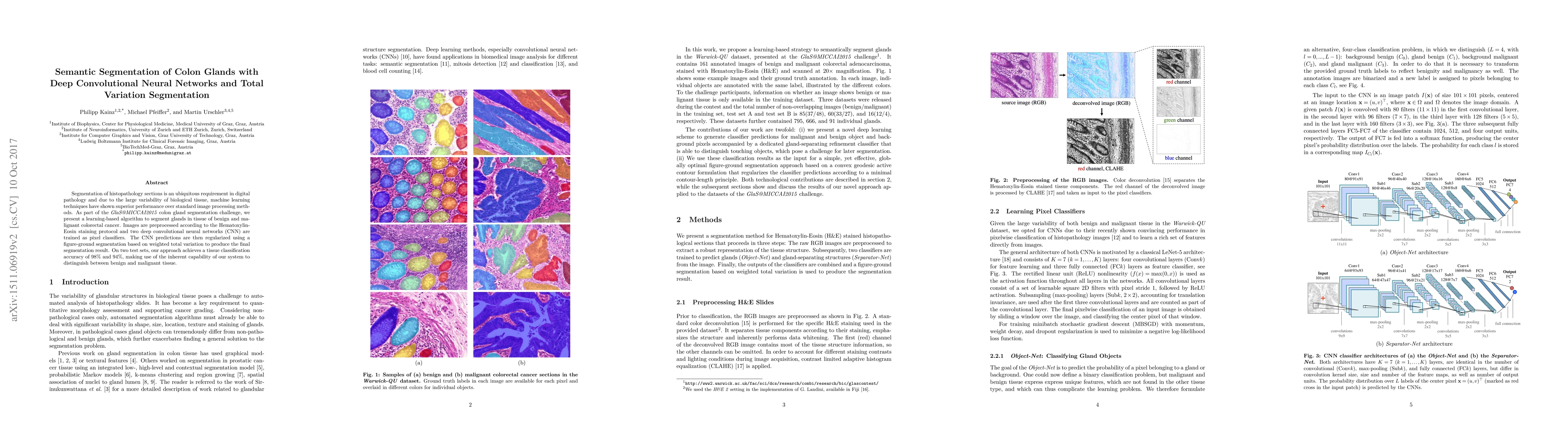 Segmentation of histopathology sections is an ubiquitous requirement in digital pathology and due to the large variability of biological tissue, machine learning techniques have shown superior performance over standard image processing methods. As part of the GlaS@MICCAI2015 colon gland segmentation challenge, we present a learning-based algorithm to segment glands in tissue of benign and malignant colorectal cancer. Images are preprocessed according to the Hematoxylin-Eosin staining protocol and two deep convolutional neural networks (CNN) are trained as pixel classifiers. The CNN predictions are then regularized using a figure-ground segmentation based on weighted total variation to produce the final segmentation result. On two test sets, our approach achieves a tissue classification accuracy of 98% and 94%, making use of the inherent capability of our system to distinguish between benign and malignant tissue.