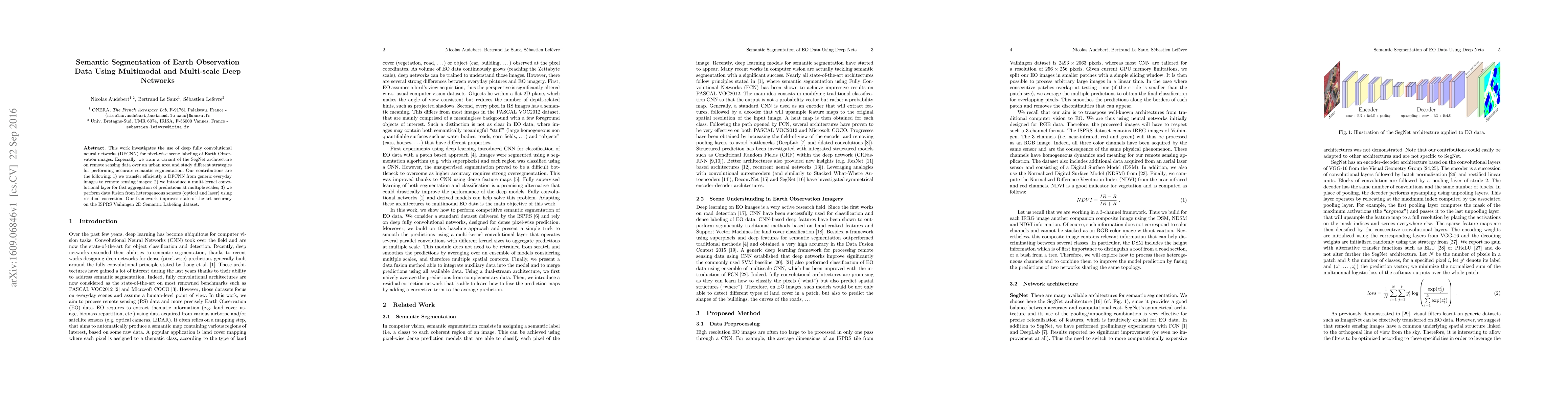This paper explores deep fully convolutional neural networks for semantic segmentation of Earth Observation images, specifically adapting SegNet for urban remote sensing data. The authors introduce a multi-kernel convolutional layer and sensor data fusion techniques, achieving superior performance on the ISPRS Vaihingen dataset.