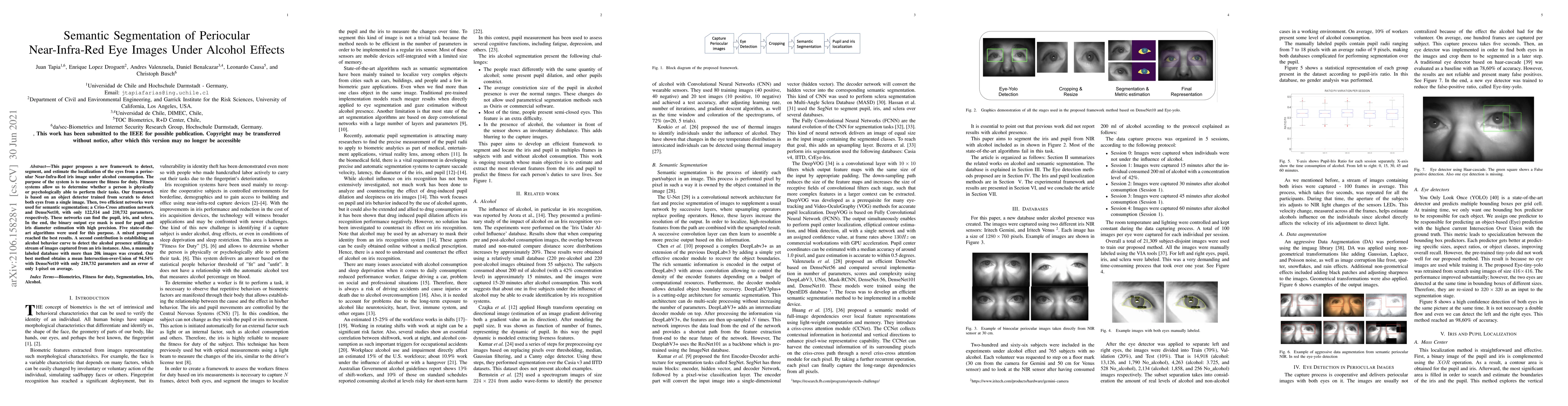 This paper proposes a new framework to detect, segment, and estimate the localization of the eyes from a periocular Near-Infra-Red iris image under alcohol consumption. The purpose of the system is to measure the fitness for duty. Fitness systems allow us to determine whether a person is physically or psychologically able to perform their tasks. Our framework is based on an object detector trained from scratch to detect both eyes from a single image. Then, two efficient networks were used for semantic segmentation; a Criss-Cross attention network and DenseNet10, with only 122,514 and 210,732 parameters, respectively. These networks can find the pupil, iris, and sclera. In the end, the binary output eye mask is used for pupil and iris diameter estimation with high precision. Five state-of-the-art algorithms were used for this purpose. A mixed proposal reached the best results. A second contribution is establishing an alcohol behavior curve to detect the alcohol presence utilizing a stream of images captured from an iris instance. Also, a manually labeled database with more than 20k images was created. Our best method obtains a mean Intersection-over-Union of 94.54% with DenseNet10 with only 210,732 parameters and an error of only 1-pixel on average.