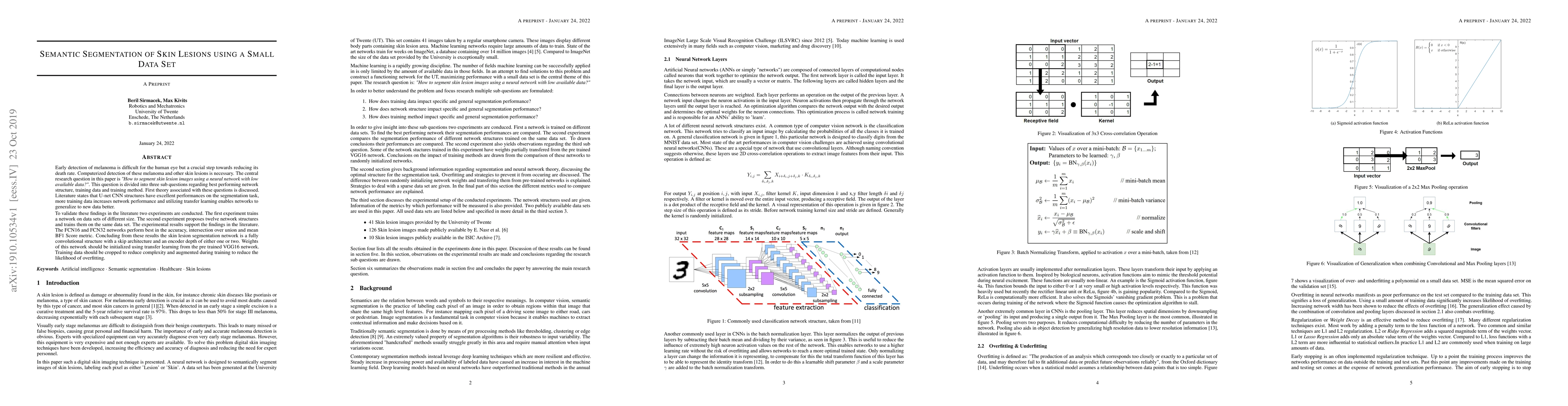 Early detection of melanoma is difficult for the human eye but a crucial step towards reducing its death rate. Computerized detection of these melanoma and other skin lesions is necessary. The central research question in this paper is "How to segment skin lesion images using a neural network with low available data?". This question is divided into three sub questions regarding best performing network structure, training data and training method. First theory associated with these questions is discussed. Literature states that U-net CNN structures have excellent performances on the segmentation task, more training data increases network performance and utilizing transfer learning enables networks to generalize to new data better. To validate these findings in the literature two experiments are conducted. The first experiment trains a network on data sets of different size. The second experiment proposes twelve network structures and trains them on the same data set. The experimental results support the findings in the literature. The FCN16 and FCN32 networks perform best in the accuracy, intersection over union and mean BF1 Score metric. Concluding from these results the skin lesion segmentation network is a fully convolutional structure with a skip architecture and an encoder depth of either one or two. Weights of this network should be initialized using transfer learning from the pre trained VGG16 network. Training data should be cropped to reduce complexity and augmented during training to reduce the likelihood of overfitting.