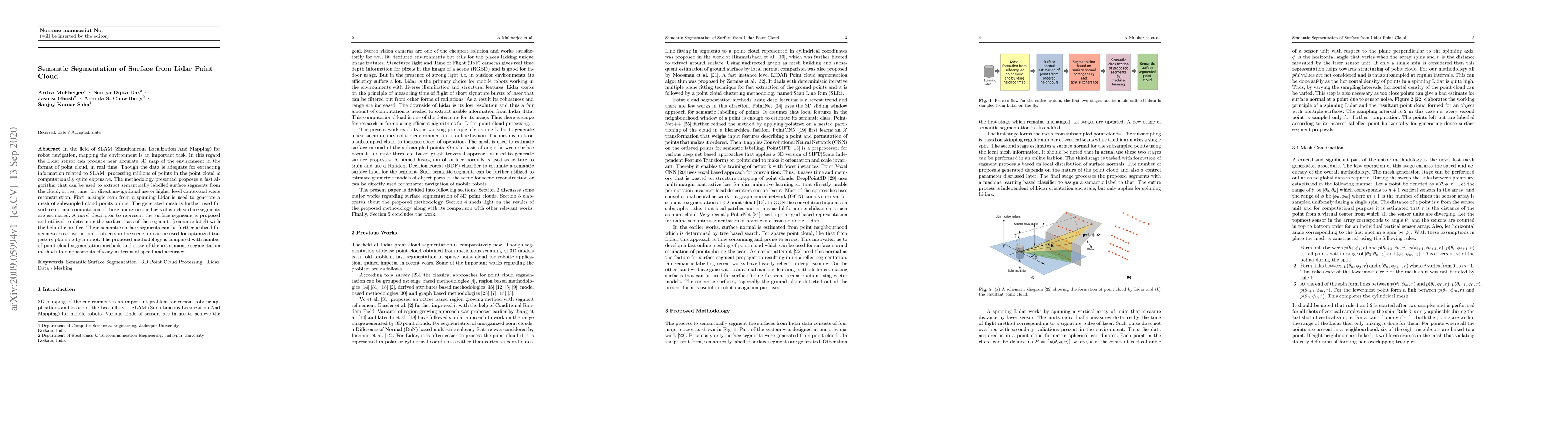 In the field of SLAM (Simultaneous Localization And Mapping) for robot navigation, mapping the environment is an important task. In this regard the Lidar sensor can produce near accurate 3D map of the environment in the format of point cloud, in real time. Though the data is adequate for extracting information related to SLAM, processing millions of points in the point cloud is computationally quite expensive. The methodology presented proposes a fast algorithm that can be used to extract semantically labelled surface segments from the cloud, in real time, for direct navigational use or higher level contextual scene reconstruction. First, a single scan from a spinning Lidar is used to generate a mesh of subsampled cloud points online. The generated mesh is further used for surface normal computation of those points on the basis of which surface segments are estimated. A novel descriptor to represent the surface segments is proposed and utilized to determine the surface class of the segments (semantic label) with the help of classifier. These semantic surface segments can be further utilized for geometric reconstruction of objects in the scene, or can be used for optimized trajectory planning by a robot. The proposed methodology is compared with number of point cloud segmentation methods and state of the art semantic segmentation methods to emphasize its efficacy in terms of speed and accuracy.