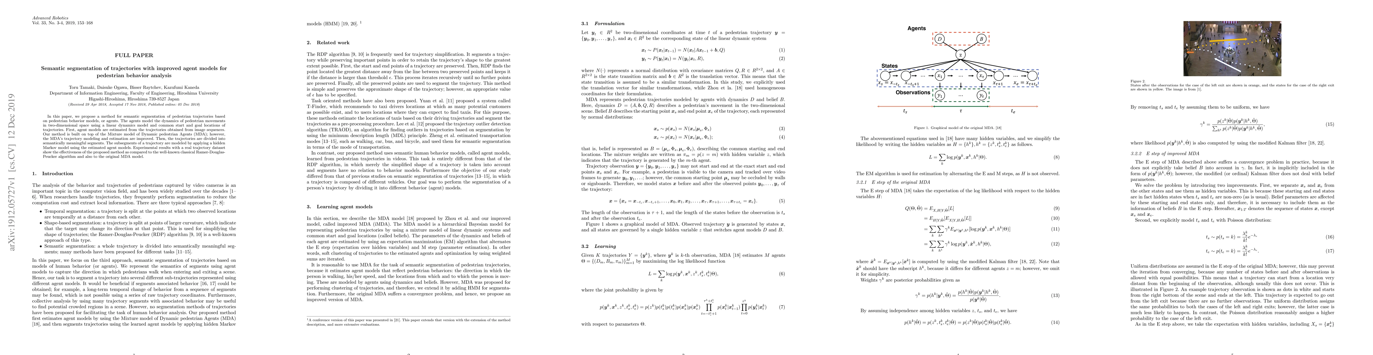 This paper proposes a method for semantic segmentation of pedestrian trajectories using improved agent models that capture pedestrian movement dynamics. The method enhances the Mixture model of Dynamic pedestrian Agents (MDA) and demonstrates superior performance over classical algorithms and the original MDA model in real dataset experiments.