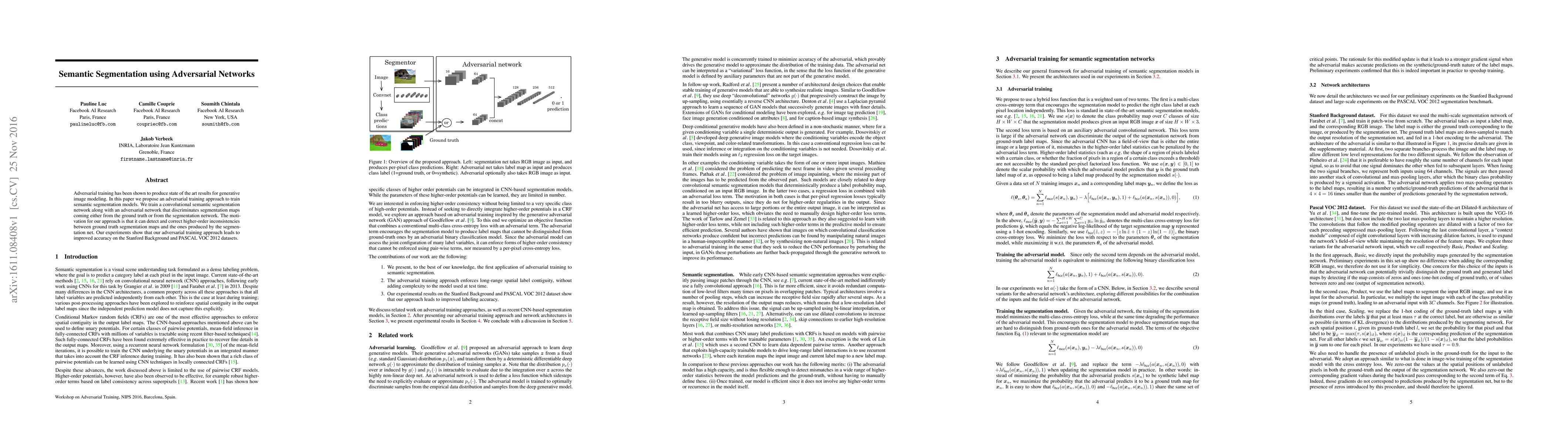 This paper proposes an adversarial training method to enhance semantic segmentation models by training a convolutional network alongside an adversarial discriminator to detect and correct inconsistencies between predicted and ground truth segmentation maps, resulting in improved accuracy on the Stanford Background and PASCAL VOC 2012 datasets.