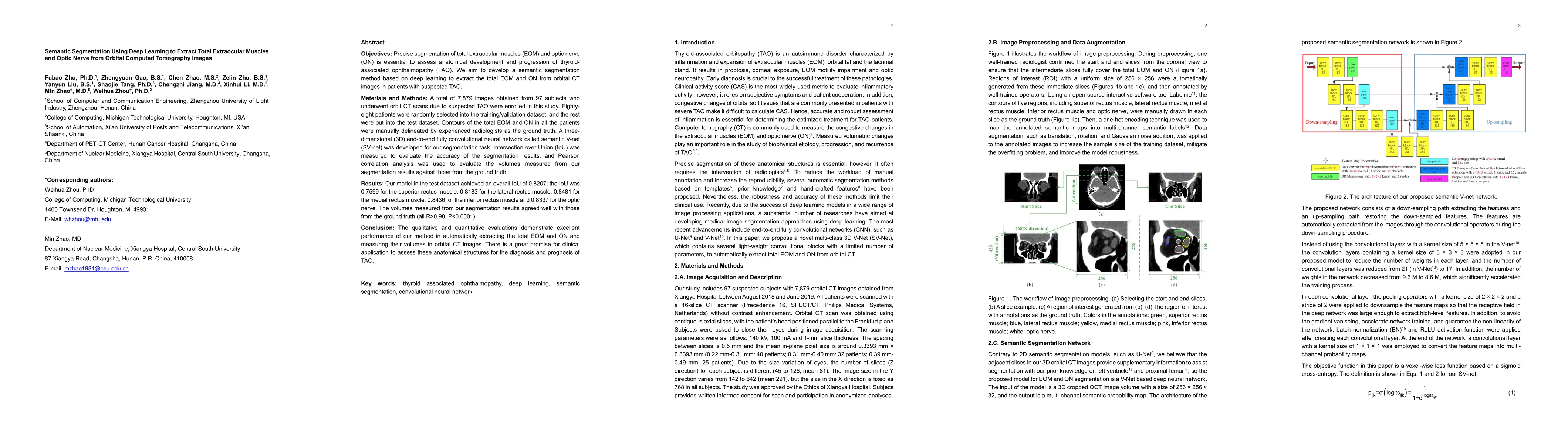 The development and validation of a 3D semantic V-net (SV-net) for accurate segmentation of EOM and ON in orbital CT images, providing a robust method for quantitative analysis of these structures.