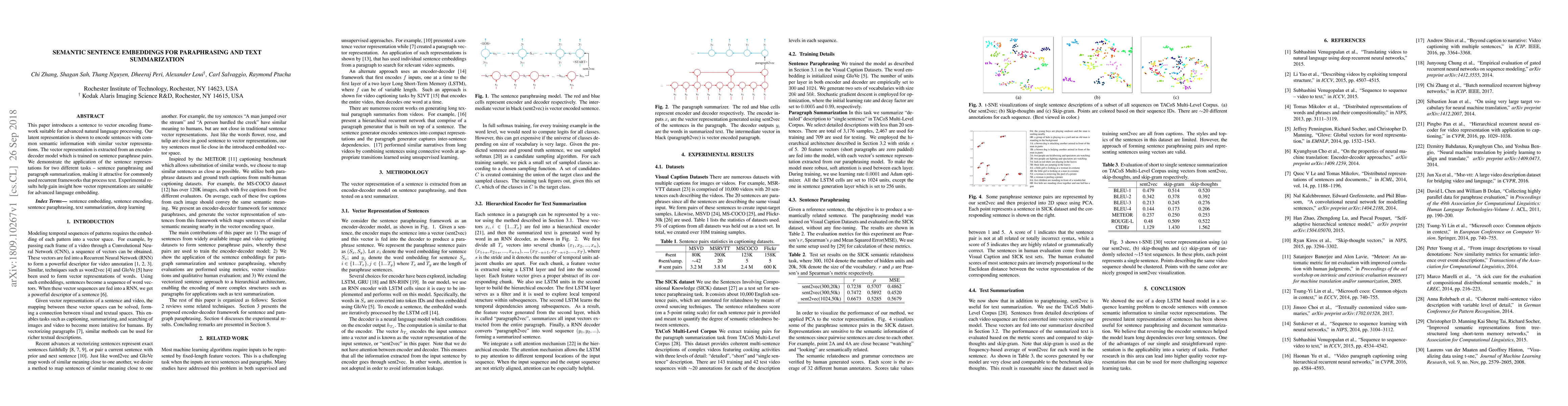 This paper introduces a sentence to vector encoding framework suitable for advanced natural language processing. Our latent representation is shown to encode sentences with common semantic information with similar vector representations. The vector representation is extracted from an encoder-decoder model which is trained on sentence paraphrase pairs. We demonstrate the application of the sentence representations for two different tasks -- sentence paraphrasing and paragraph summarization, making it attractive for commonly used recurrent frameworks that process text. Experimental results help gain insight how vector representations are suitable for advanced language embedding.