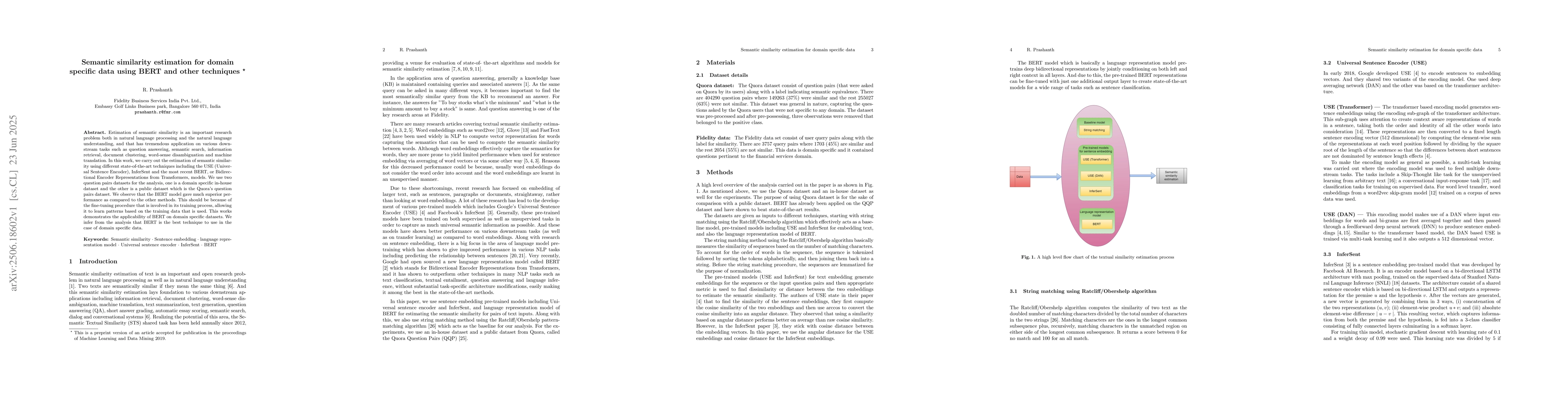 Estimation of semantic similarity is an important research problem both in natural language processing and the natural language understanding, and that has tremendous application on various downstream tasks such as question answering, semantic search, information retrieval, document clustering, word-sense disambiguation and machine translation. In this work, we carry out the estimation of semantic similarity using different state-of-the-art techniques including the USE (Universal Sentence Encoder), InferSent and the most recent BERT, or Bidirectional Encoder Representations from Transformers, models. We use two question pairs datasets for the analysis, one is a domain specific in-house dataset and the other is a public dataset which is the Quora's question pairs dataset. We observe that the BERT model gave much superior performance as compared to the other methods. This should be because of the fine-tuning procedure that is involved in its training process, allowing it to learn patterns based on the training data that is used. This works demonstrates the applicability of BERT on domain specific datasets. We infer from the analysis that BERT is the best technique to use in the case of domain specific data.
