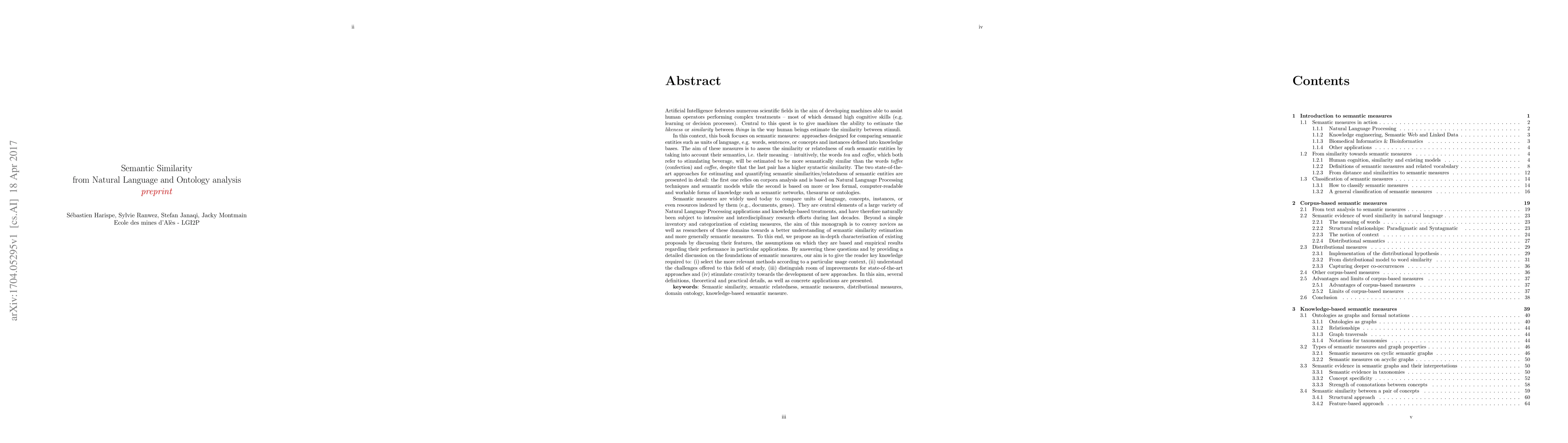 Artificial Intelligence federates numerous scientific fields in the aim of developing machines able to assist human operators performing complex treatments -- most of which demand high cognitive skills (e.g. learning or decision processes). Central to this quest is to give machines the ability to estimate the likeness or similarity between things in the way human beings estimate the similarity between stimuli. In this context, this book focuses on semantic measures: approaches designed for comparing semantic entities such as units of language, e.g. words, sentences, or concepts and instances defined into knowledge bases. The aim of these measures is to assess the similarity or relatedness of such semantic entities by taking into account their semantics, i.e. their meaning -- intuitively, the words tea and coffee, which both refer to stimulating beverage, will be estimated to be more semantically similar than the words toffee (confection) and coffee, despite that the last pair has a higher syntactic similarity. The two state-of-the-art approaches for estimating and quantifying semantic similarities/relatedness of semantic entities are presented in detail: the first one relies on corpora analysis and is based on Natural Language Processing techniques and semantic models while the second is based on more or less formal, computer-readable and workable forms of knowledge such as semantic networks, thesaurus or ontologies. (...) Beyond a simple inventory and categorization of existing measures, the aim of this monograph is to convey novices as well as researchers of these domains towards a better understanding of semantic similarity estimation and more generally semantic measures.