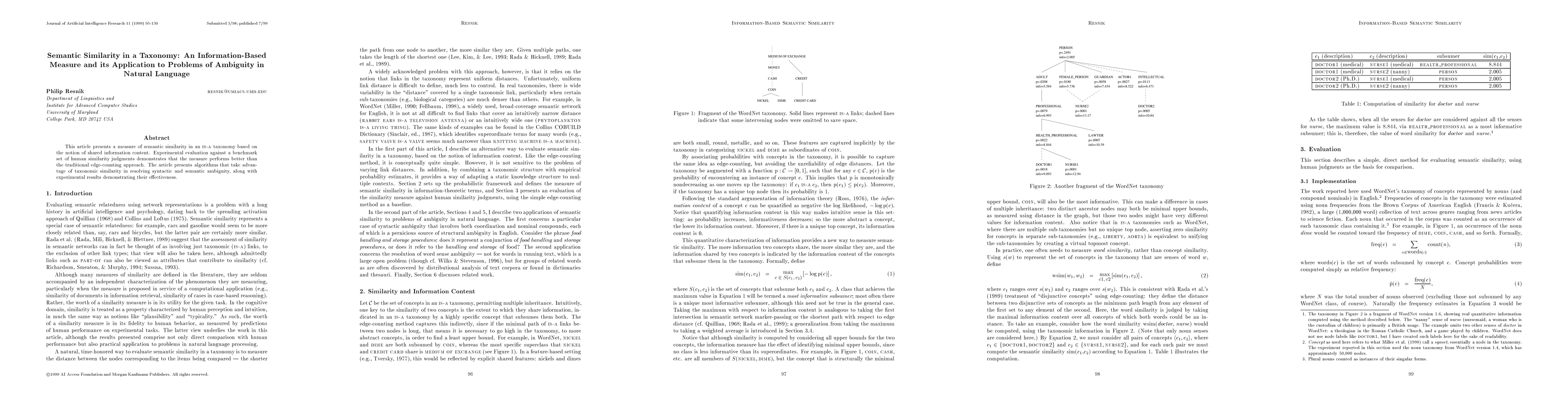 This article presents a measure of semantic similarity in an IS-A taxonomy based on the notion of shared information content. Experimental evaluation against a benchmark set of human similarity judgments demonstrates that the measure performs better than the traditional edge-counting approach. The article presents algorithms that take advantage of taxonomic similarity in resolving syntactic and semantic ambiguity, along with experimental results demonstrating their effectiveness.