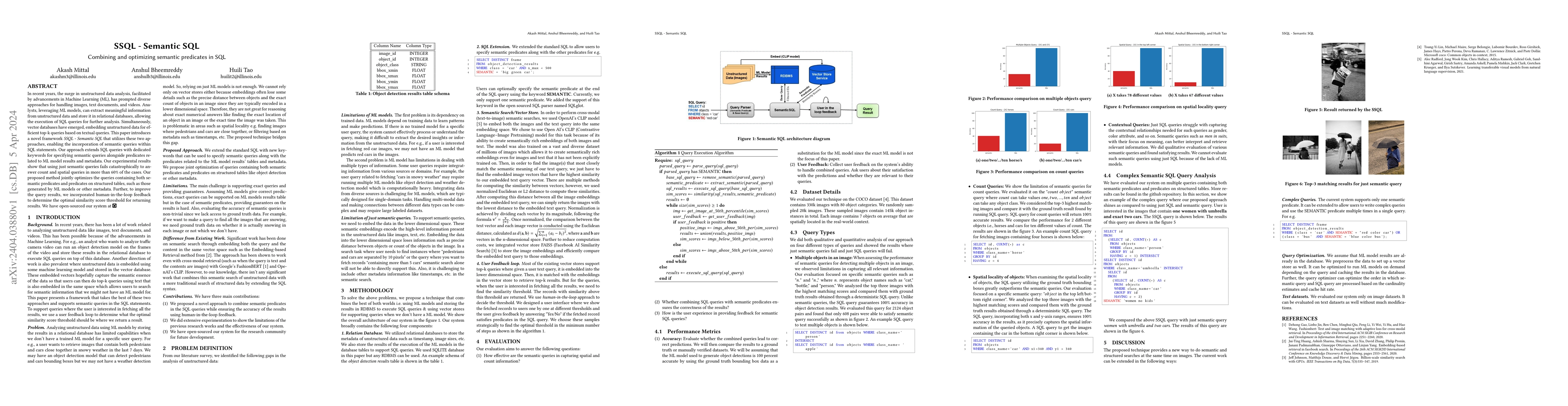 In recent years, the surge in unstructured data analysis, facilitated by advancements in Machine Learning (ML), has prompted diverse approaches for handling images, text documents, and videos. Analysts, leveraging ML models, can extract meaningful information from unstructured data and store it in relational databases, allowing the execution of SQL queries for further analysis. Simultaneously, vector databases have emerged, embedding unstructured data for efficient top-k queries based on textual queries. This paper introduces a novel framework SSQL - Semantic SQL that utilizes these two approaches, enabling the incorporation of semantic queries within SQL statements. Our approach extends SQL queries with dedicated keywords for specifying semantic queries alongside predicates related to ML model results and metadata. Our experimental results show that using just semantic queries fails catastrophically to answer count and spatial queries in more than 60% of the cases. Our proposed method jointly optimizes the queries containing both semantic predicates and predicates on structured tables, such as those generated by ML models or other metadata. Further, to improve the query results, we incorporated human-in-the-loop feedback to determine the optimal similarity score threshold for returning results.