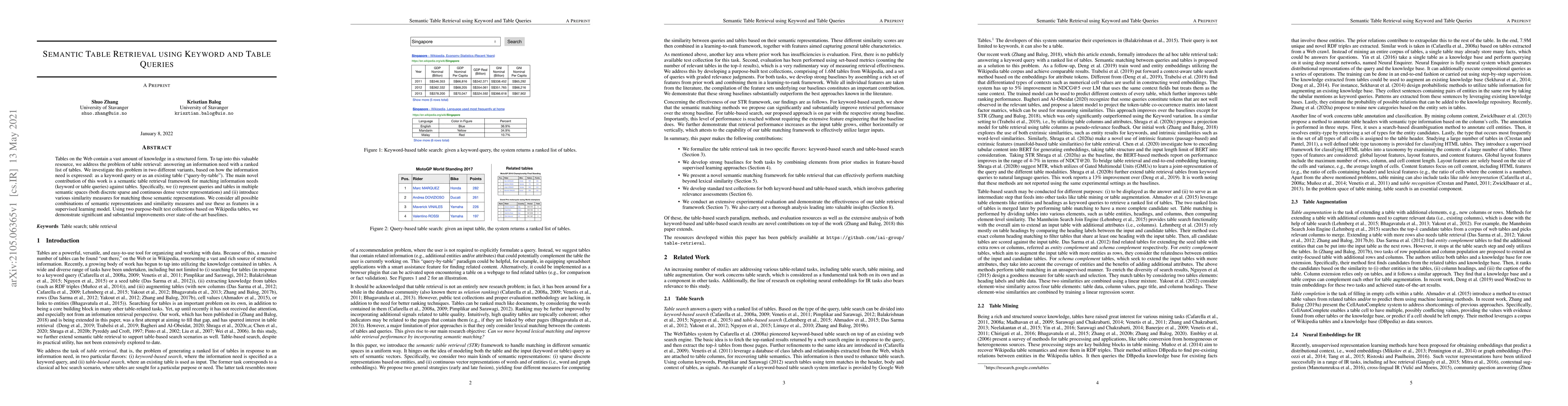 This paper proposes a semantic table retrieval framework that uses keyword and table queries to match information needs with relevant tables on the web. It leverages multiple semantic representations and similarity measures, integrated into a supervised learning model, to achieve significant improvements over existing methods in table retrieval tasks.